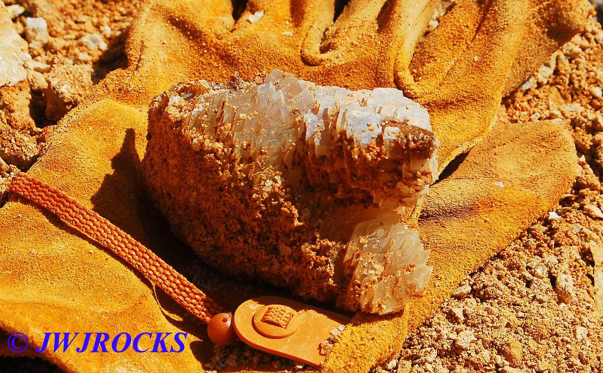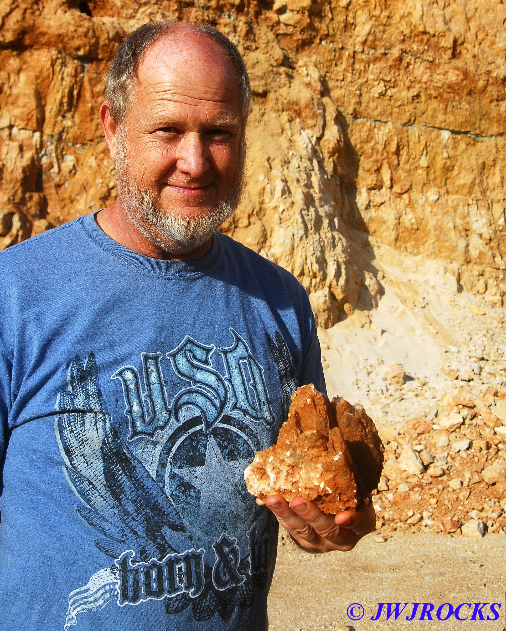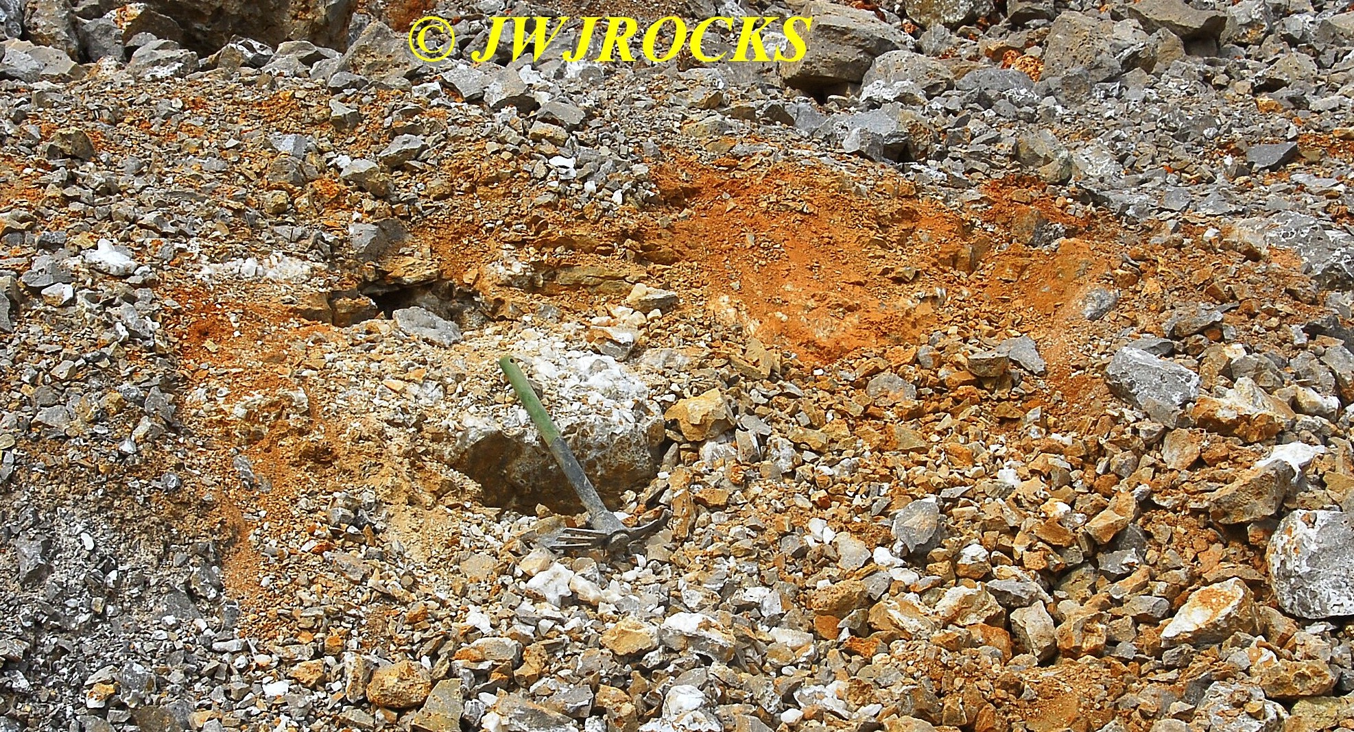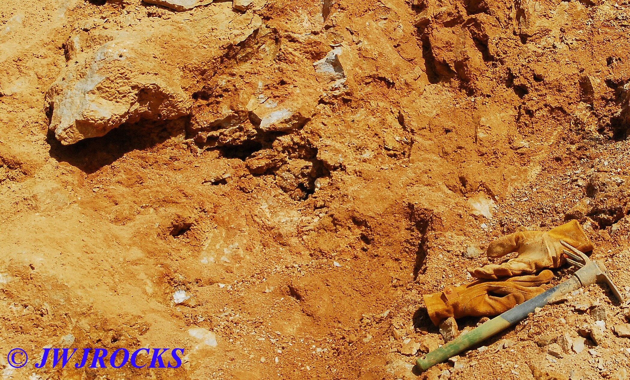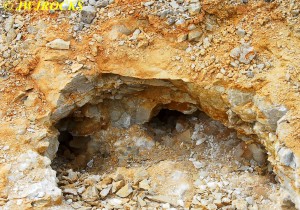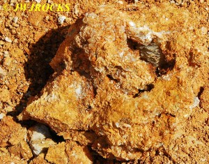 I cleaned out that pocket after it came to an abrupt stop with a very deep and narrow hole, that I was not able to see down into, nor could I even begin to chip it out to widen it, so I looked up and around, and my eyes settled on a mound of rock and dirt, that had a calcite chunk of a face…I wandered over to check it out as I had looked it over other times, and thought it had great potential….