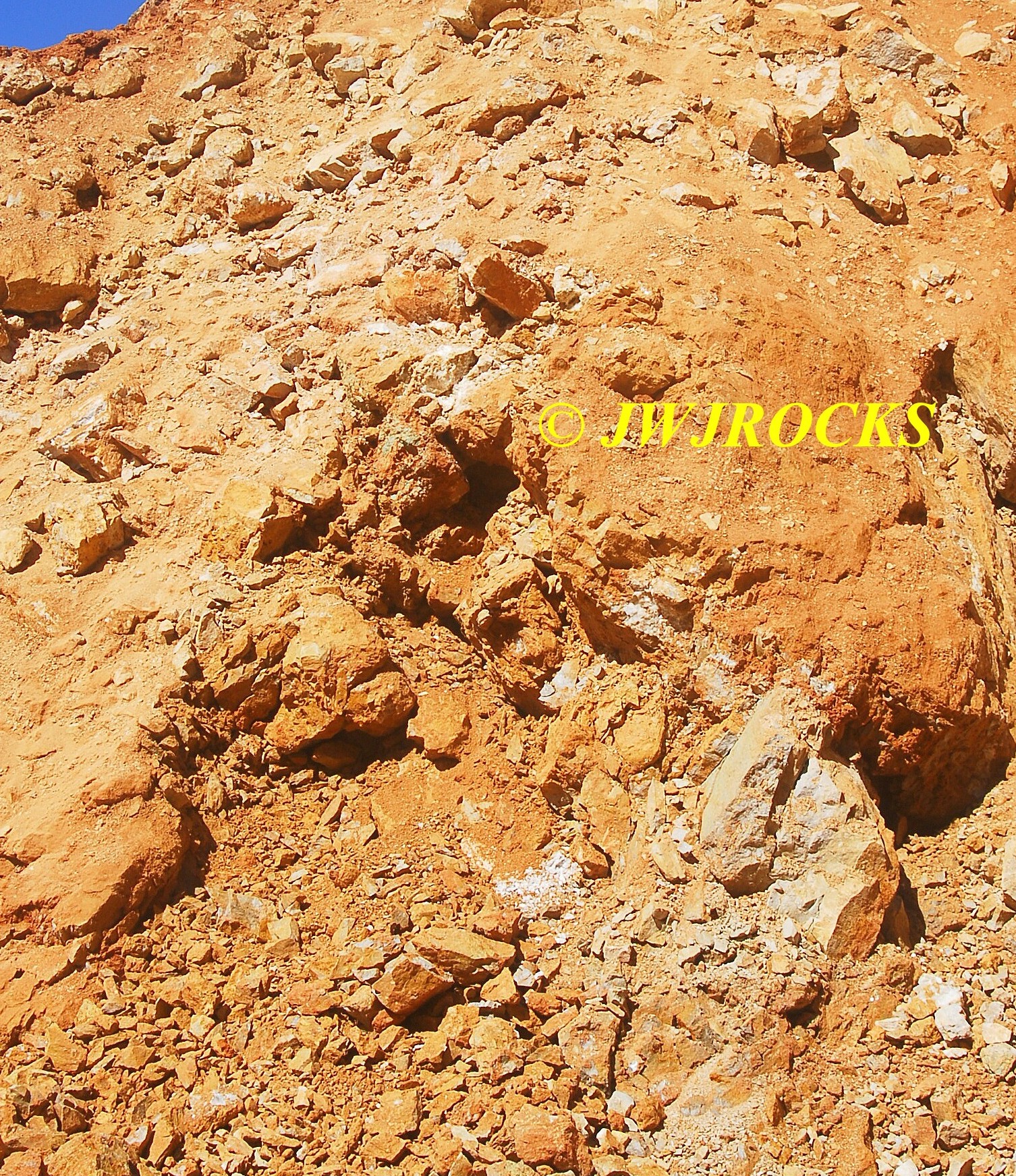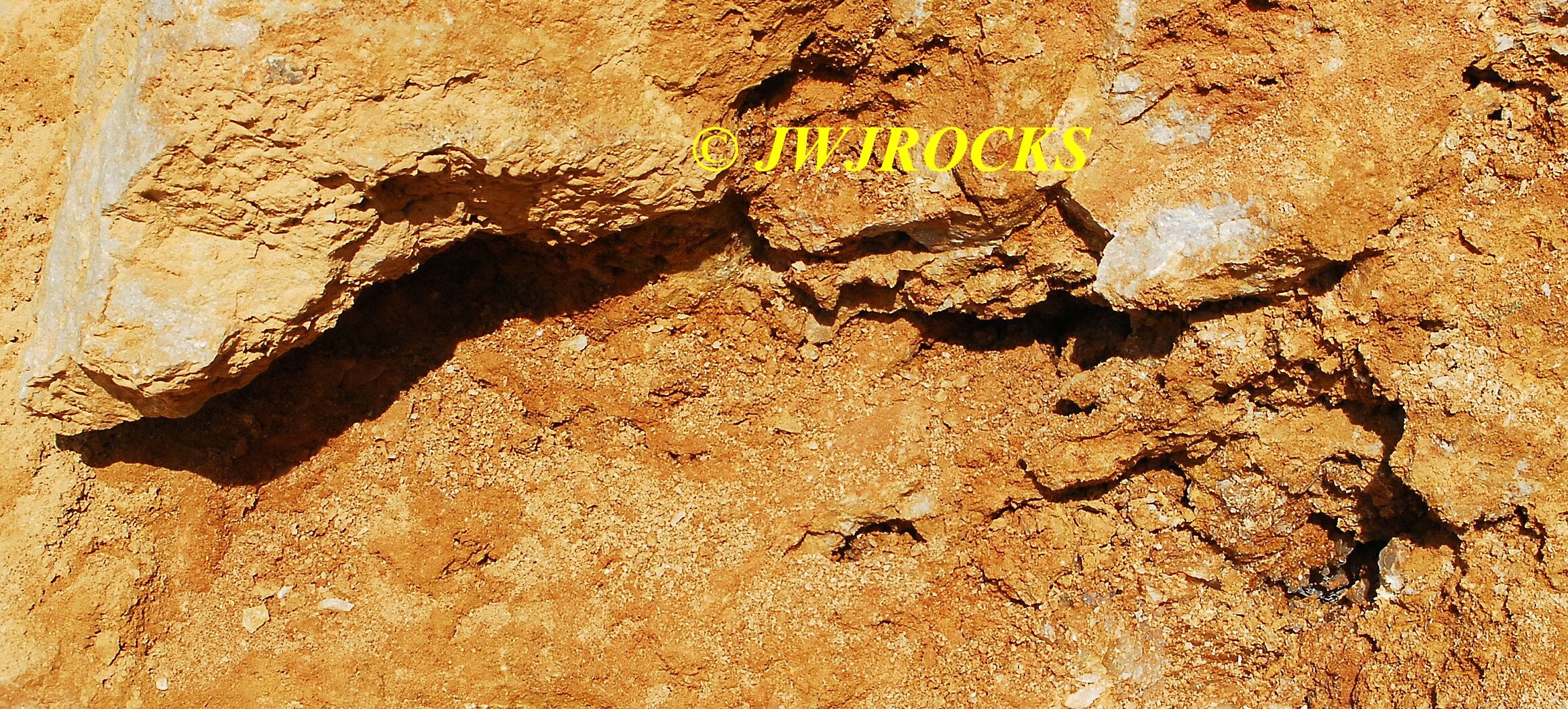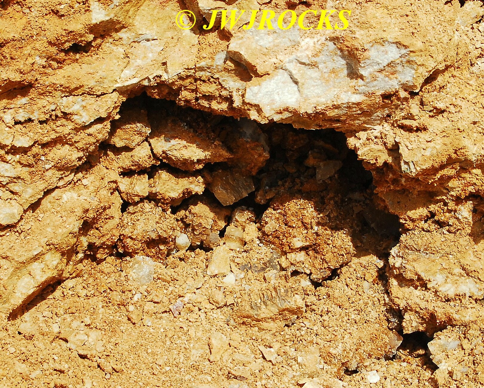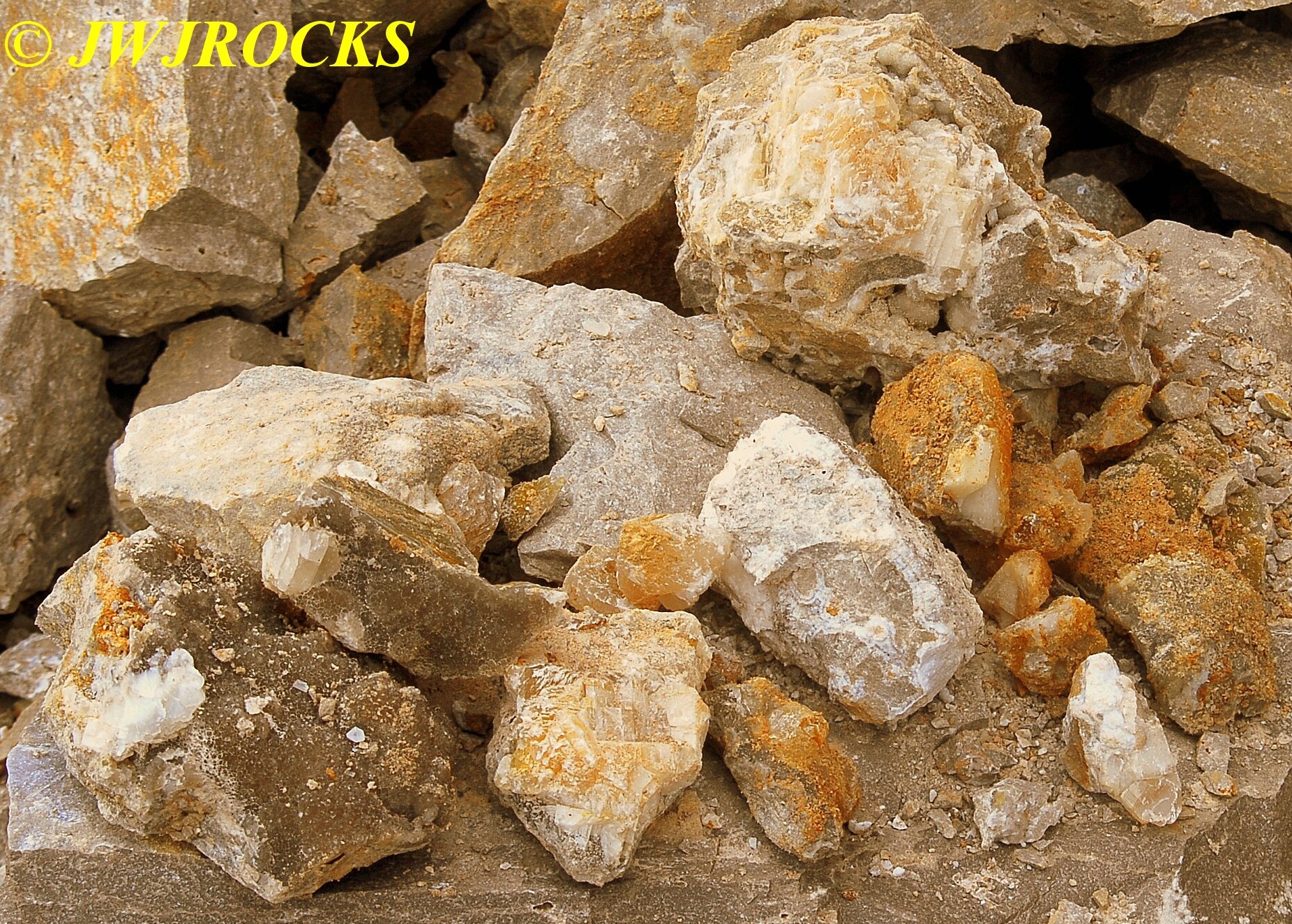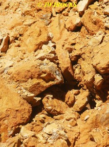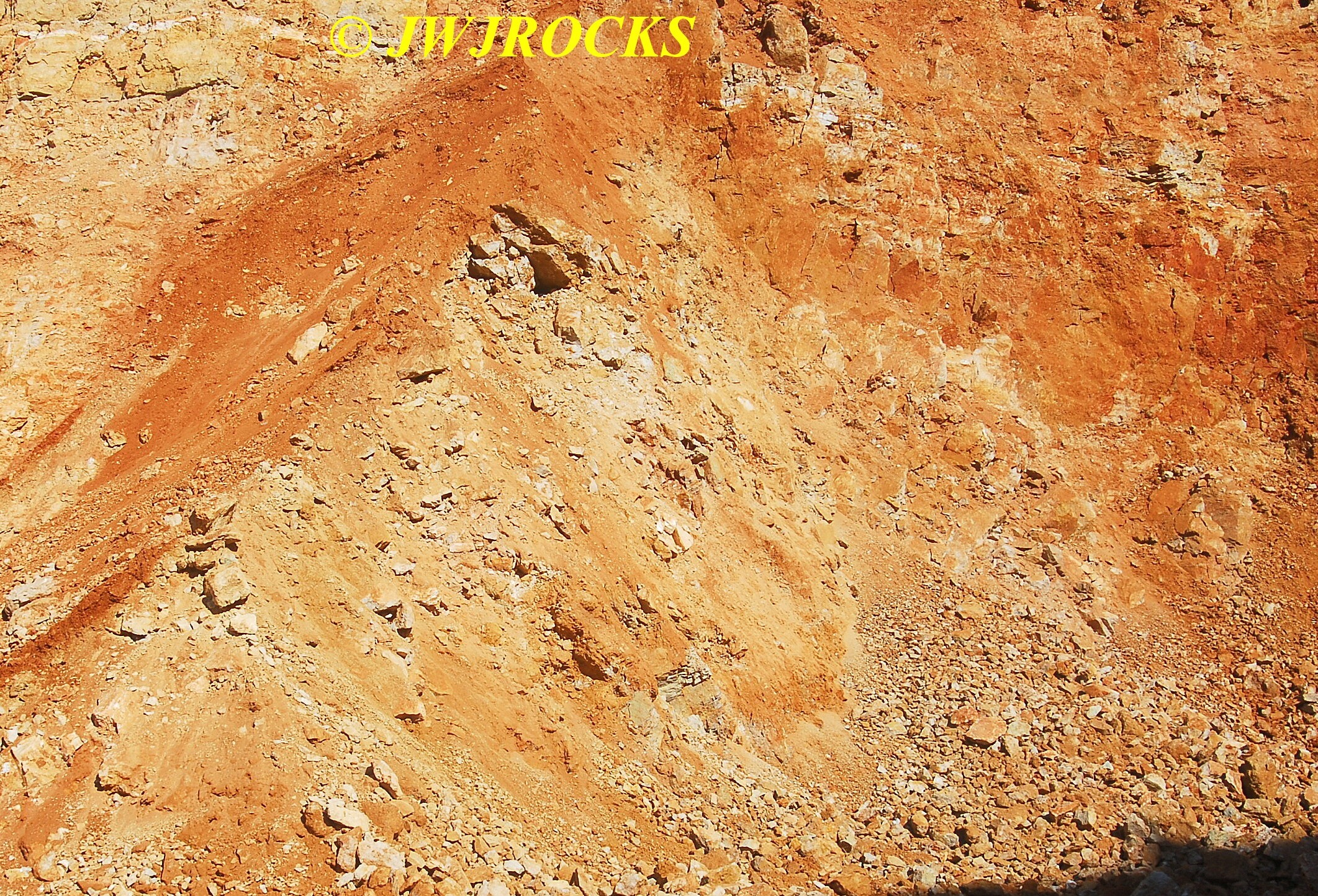 I cleaned out that pocket after it came to an abrupt stop with a very deep and narrow hole, that I was not able to see down into, nor could I even begin to chip it out to widen it, so I looked up and around, and my eyes settled on a mound of rock and dirt, that had a calcite chunk of a face…I wandered over to check it out as I had looked it over other times, and thought it had great potential….