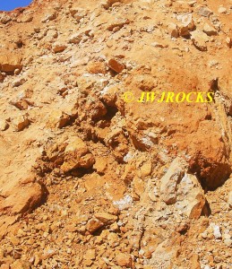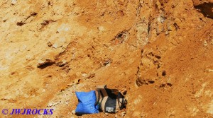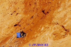 …my bags are about four feet up from the ground level, and footing up there was slip and slide, so those pockets higher than four feet were hard to reach, cause I was constantly sliding down in the loose gravel and dirt. I had filled my apron up with the smaller pocket goodies and then finally reached this area of the wall about thirty yards west of where I started and when I found this pocket, I knew I would need the bags, it was that nice looking up close….