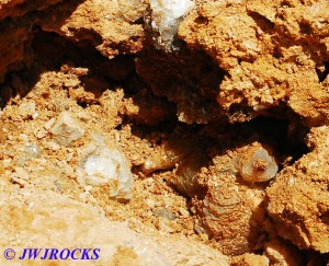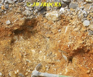 …and here is the bottom of the pocket, where you can see yet another nice poker chip hiding in the dirt….what you cant see here yet, are the many other crystals that were hiding in cluster form, mainly because I haven`t yet dug them out and exposed them, but believe me, they were there, and I was able to chip them out a few minutes later….