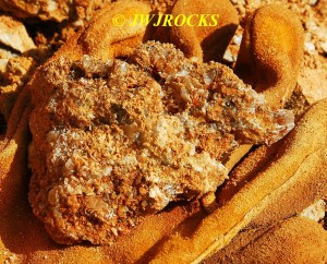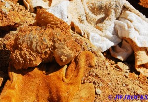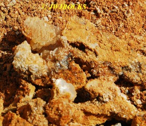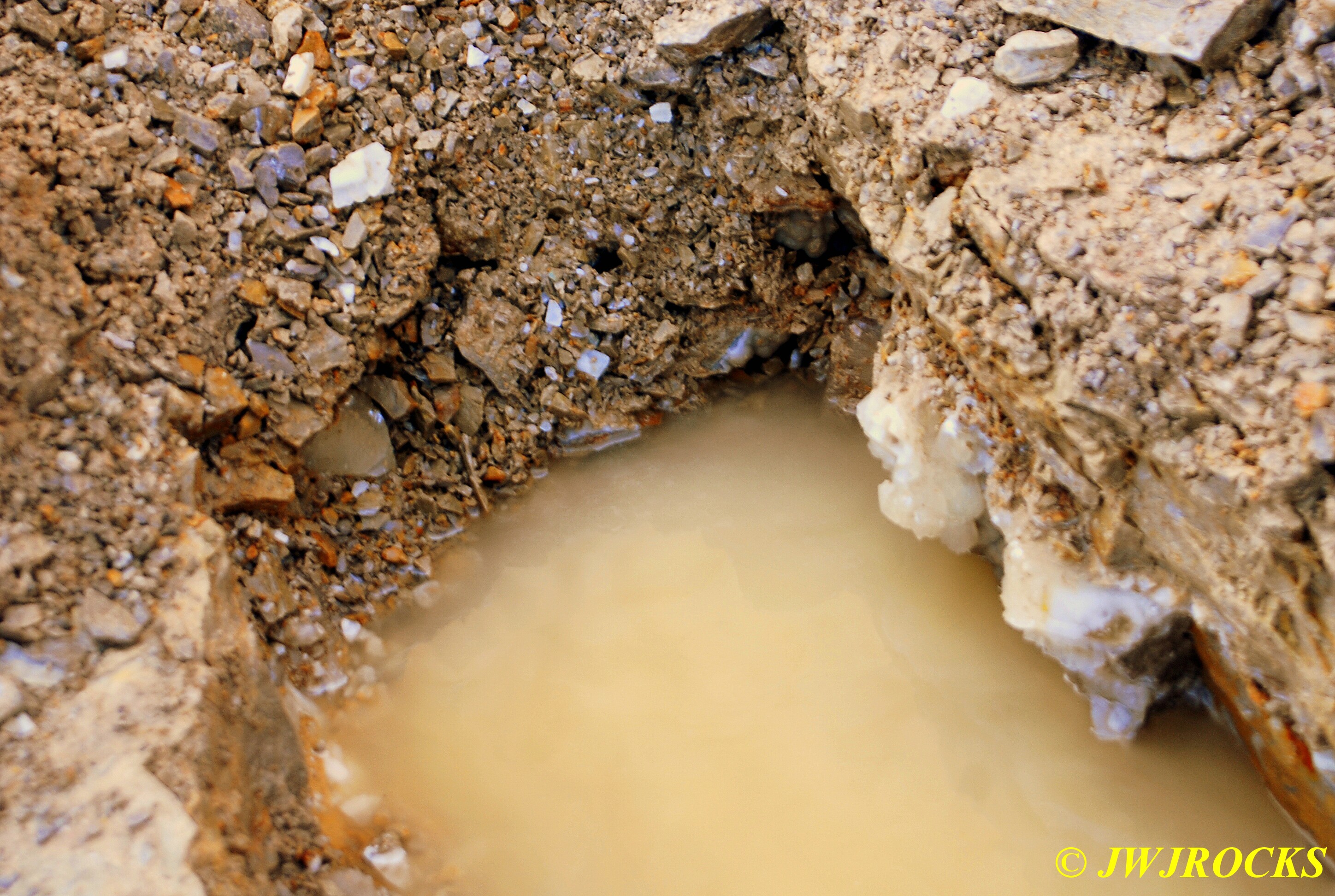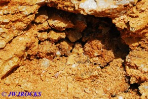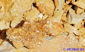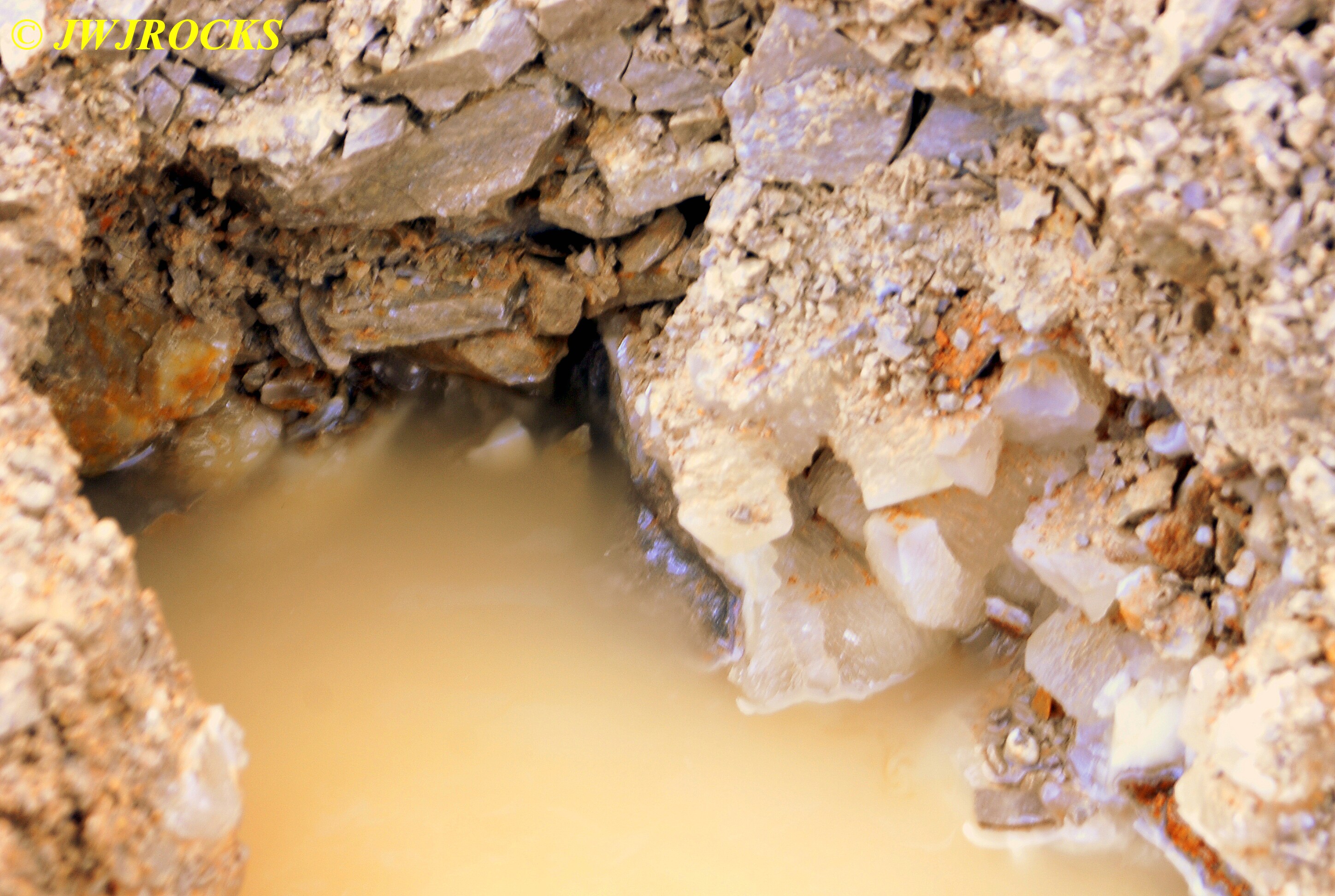 …it`s not in very good focus, but is very appealing looking and you can see some of the colors I was enjoying as well. I actually found it by doing some raking around a few likely looking bumps at the base of the wall and soon spotted some calcite indicators at the bottom of a ledge, as well as water filling the hole I was digging, which I really didnt like, but sometimes you have to take the bad with the good…..