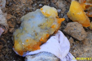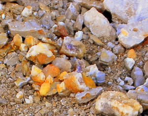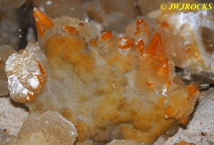 Figured I had better write this before I get too far behind and forget the details of it, found a very pretty dogtooth pocket at the new secret spot a few weeks ago, bright orange dogtooths attached to some very pretty colored druse. Missy and I didnt arrive til noon and it was the start of daylight savings time, so I knew we had at least six hours of daylight in case we needed it and it was going to be a nice warm day as well, reaching nearly 75 degrees that day. Here is one of the nicer ones I found, just to whet your appetite….