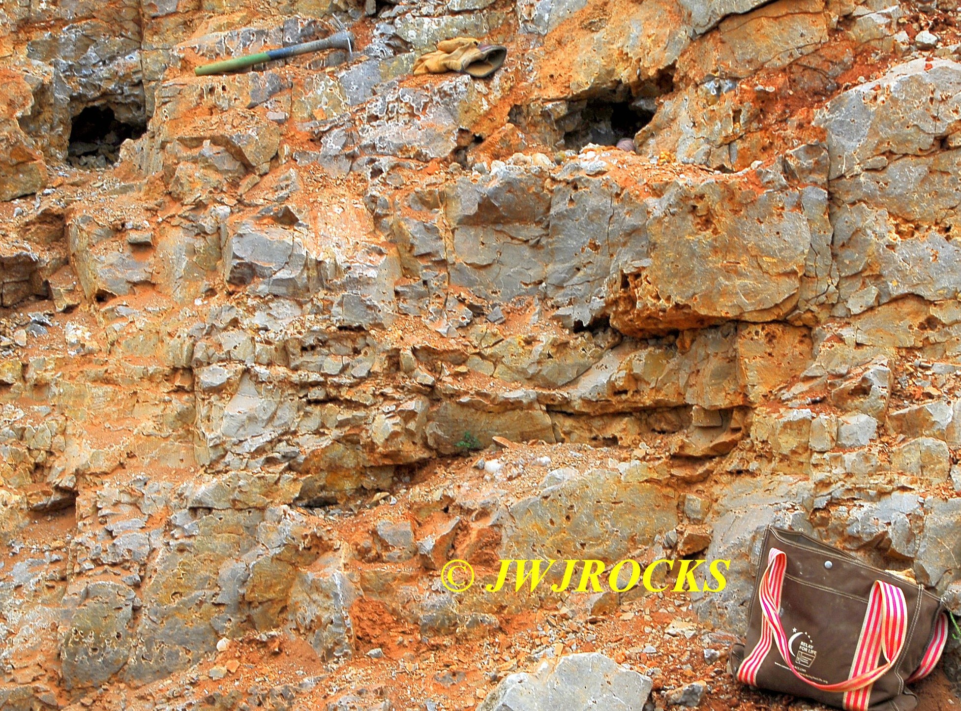 …so I began digging around in that area and soon located an opening, that continued to grow and expand til I had a pretty large opening in the wall. In the next photo you see the initial pocket above the bag and the new pocket to the left about seven feet, just to the left of my green mattox handle….