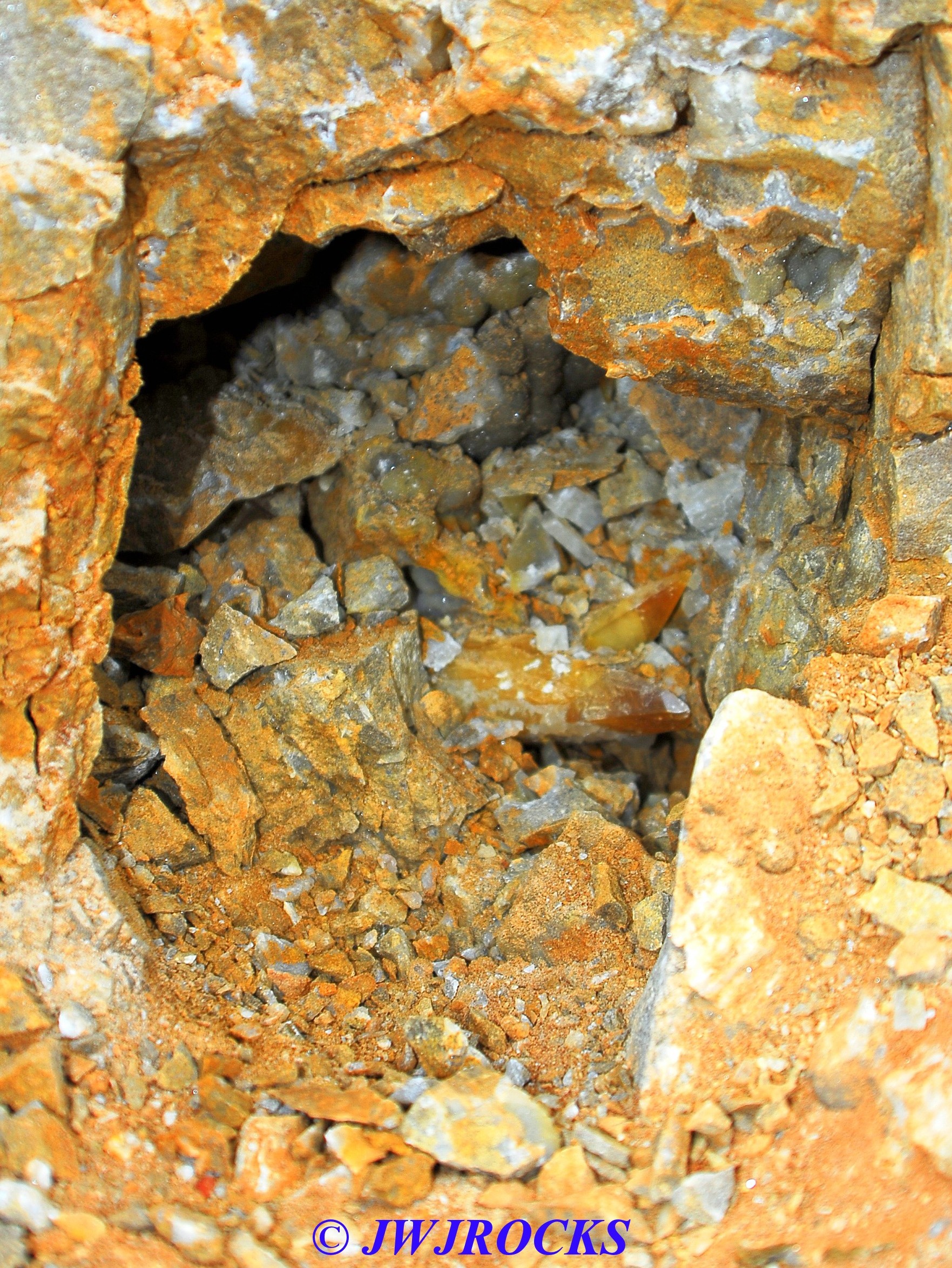I was initially pulling out some brown dogtooth crystals, so I knocked out some of the rock above the opening and took out the sides abit more, and looked inside….