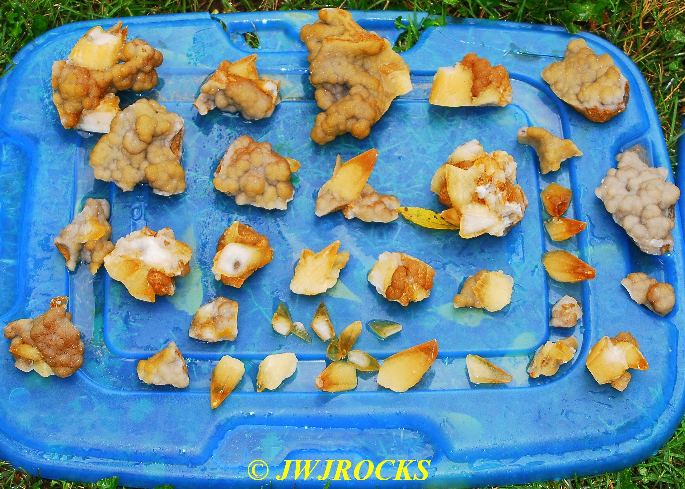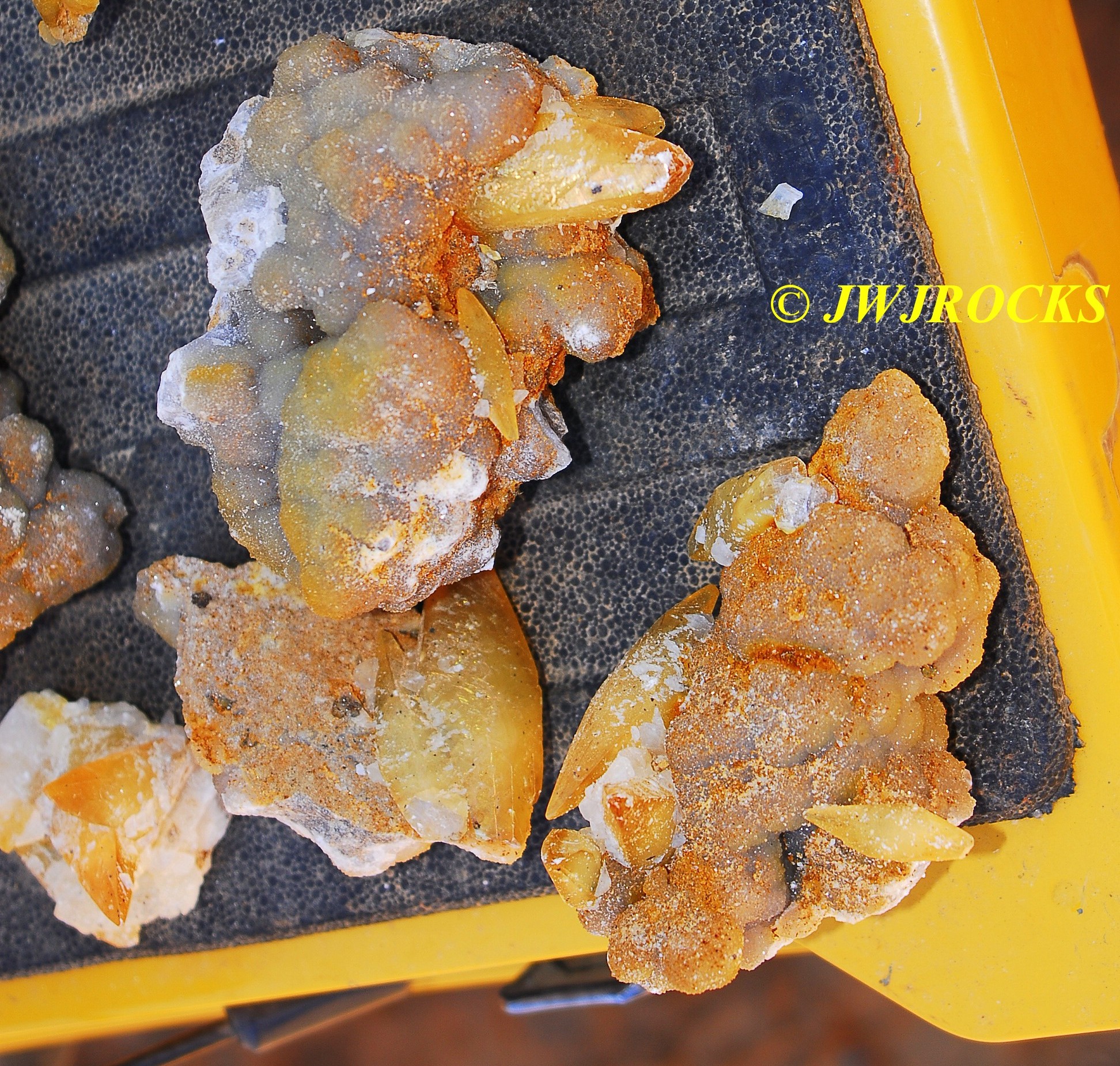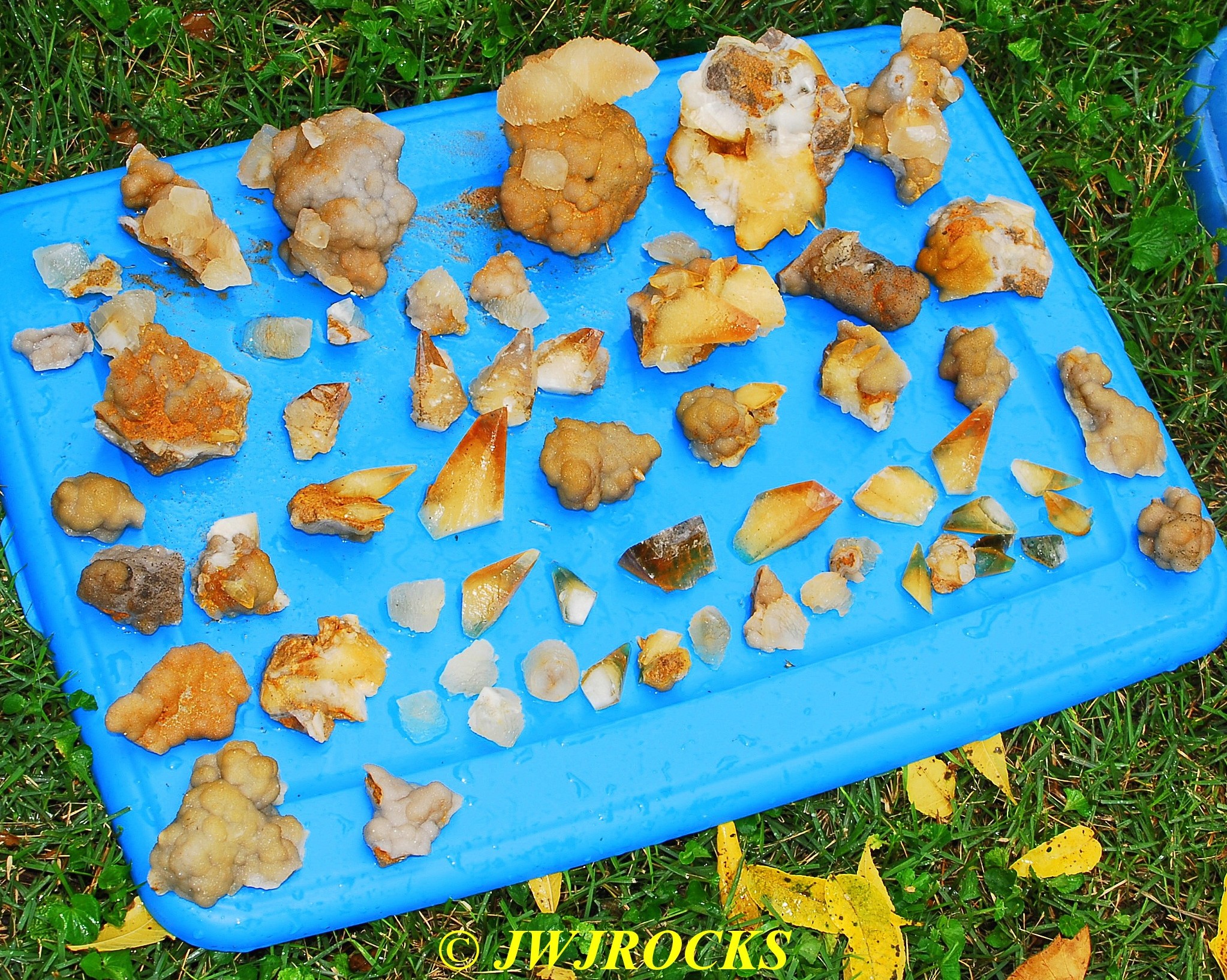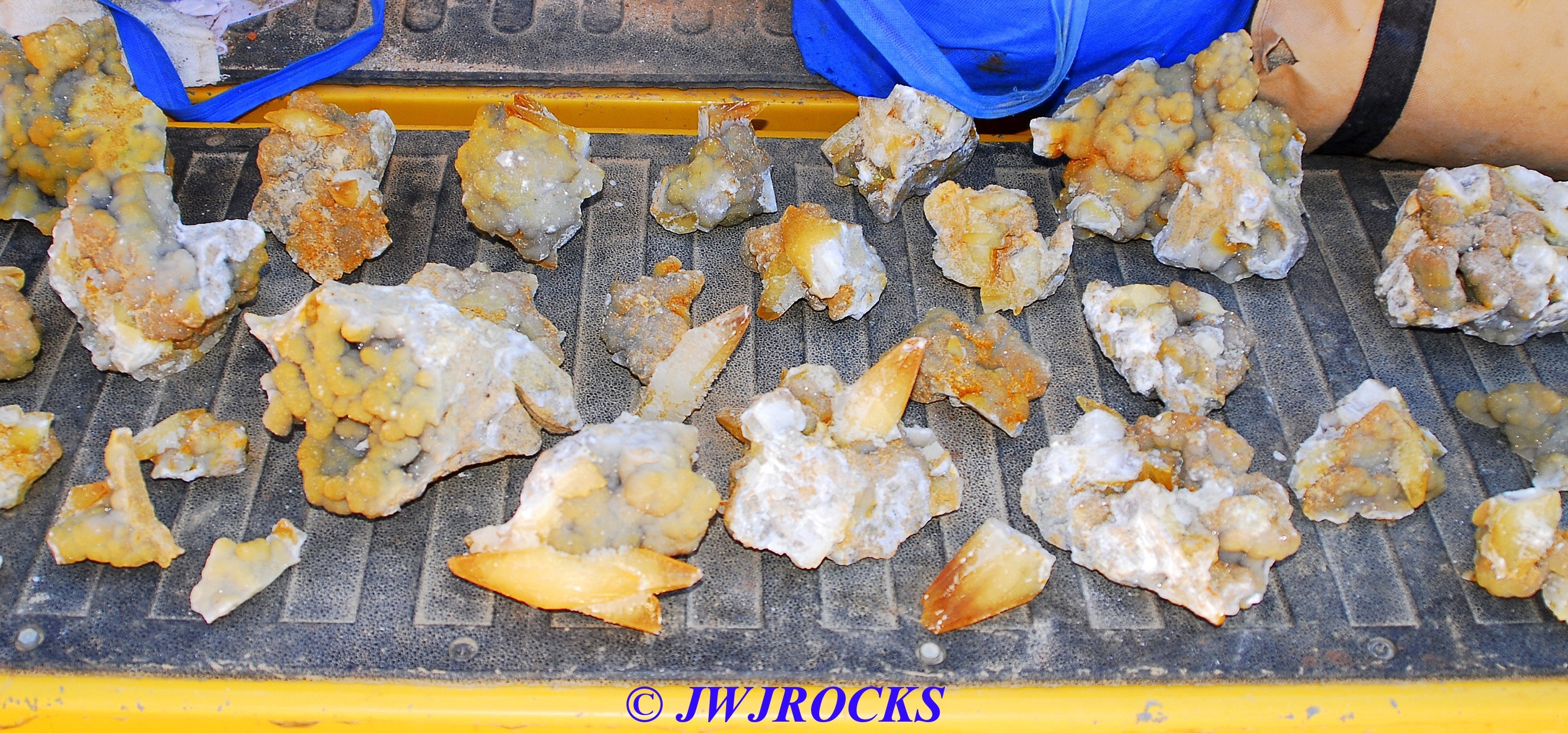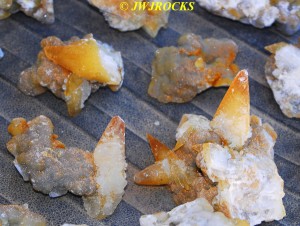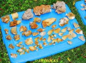 and when you look at the expansion photos above, you`ll notice a dark area at the top…that pile of rocks in front of it, consists of several medium sized clusters laying upside down with dogtooths all over the place on them…once I had carefully picked each one up and removed it from the pocket, after cleaning out all of the crystals from in front of the pile of upside down clusters first…then that dark space opened up into the back of the pocket, filled on the bottom floor with even more single crystals and small clusters….even more WOWs and HOLIE COWS coming from me by mouth and thoughts….I had planned to only be there a few hours, intending to get back in time to clean up and get a nap in before the mineral dealer friend arrived, so about an hour later, I had pulled all I could remove from the pocket, and took a water break, and then wrapped up what I had and filled five bags full of wrapped crystals, with all of those you saw on the tailgate, wrapped separately and placed in my floorboards of my truck. Here are the rest of the crystals I removed, after a good rinse at my house later in the day….