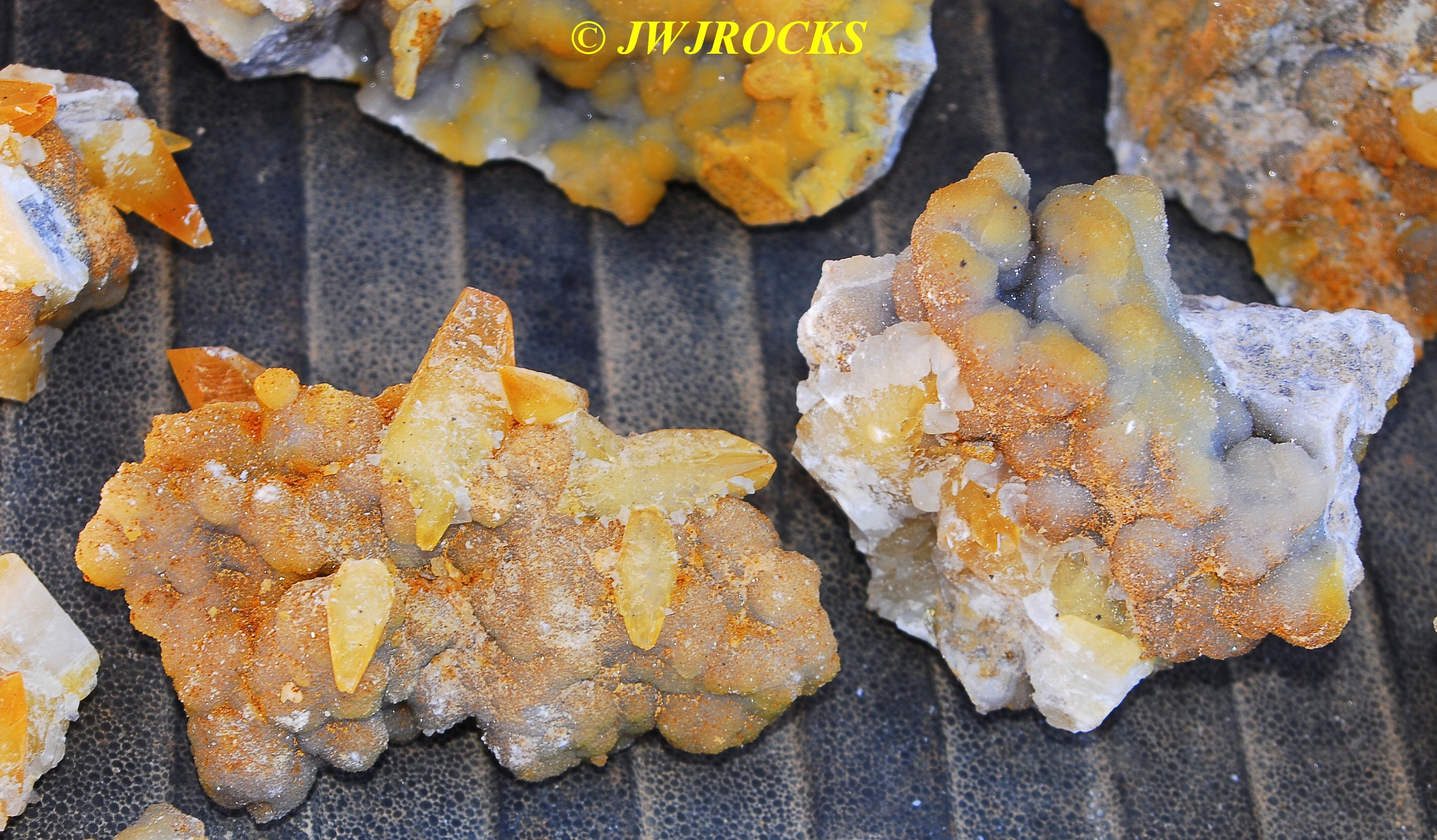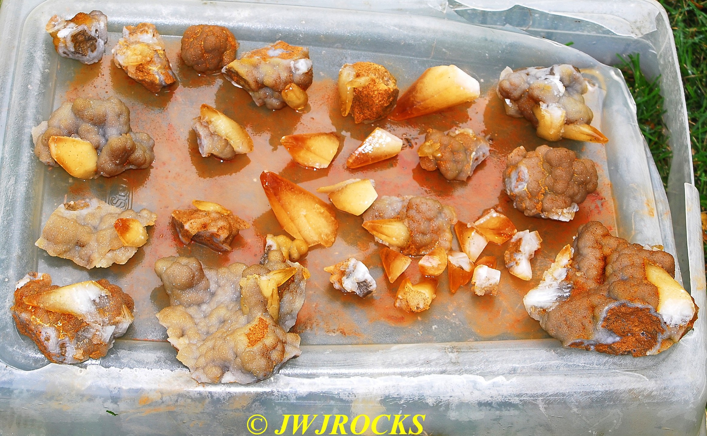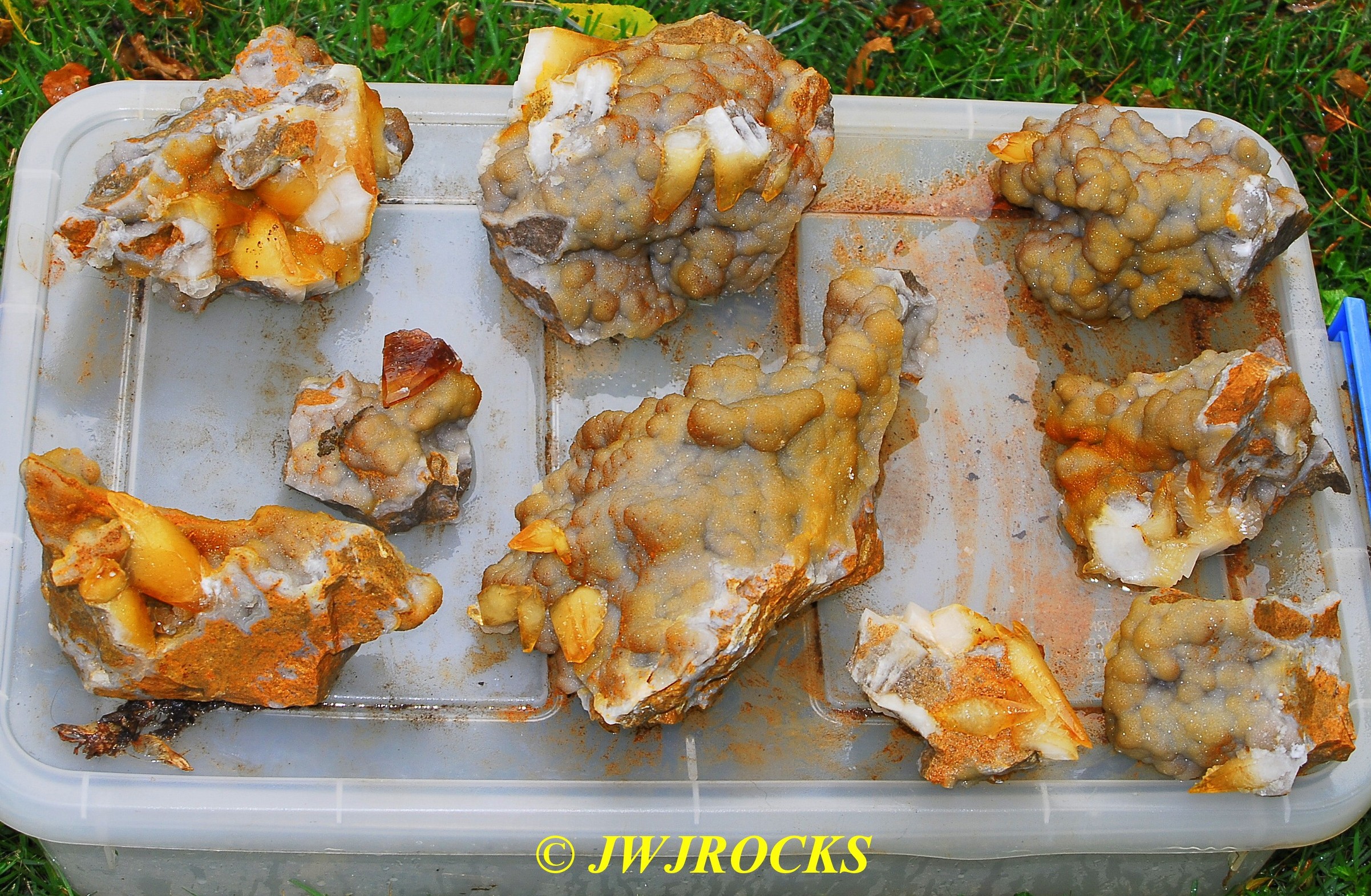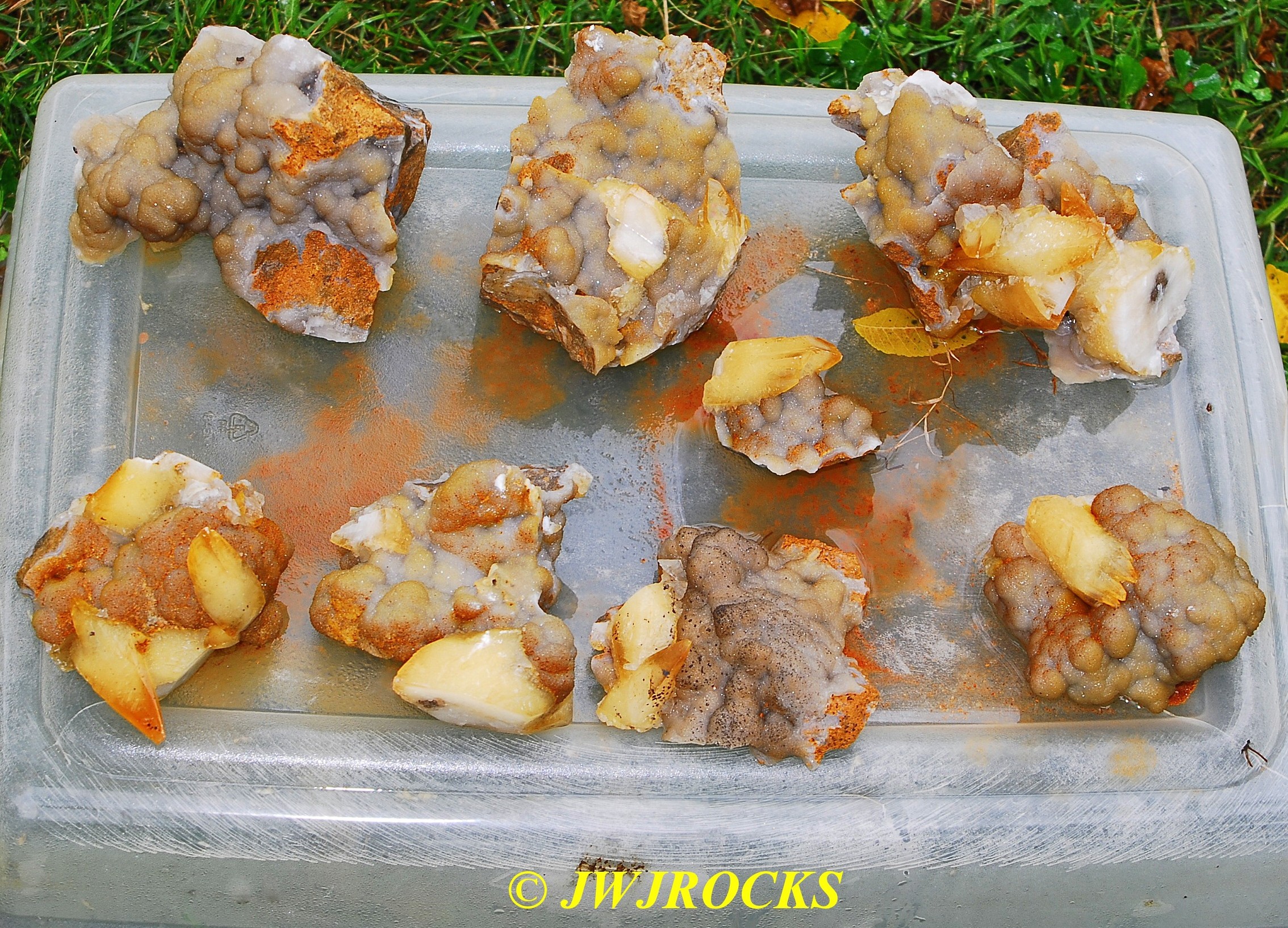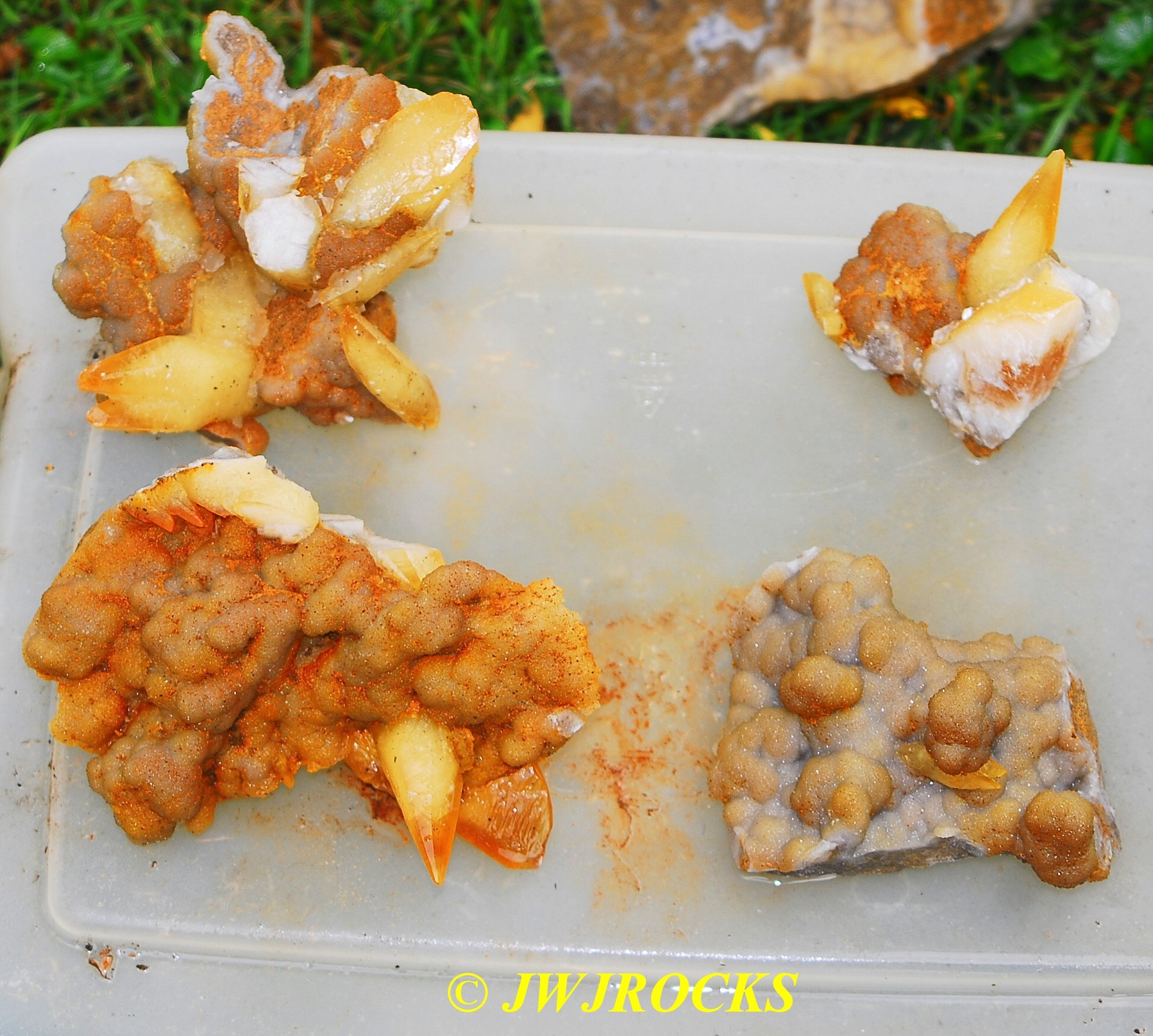 and when you look at the expansion photos above, you`ll notice a dark area at the top…that pile of rocks in front of it, consists of several medium sized clusters laying upside down with dogtooths all over the place on them…once I had carefully picked each one up and removed it from the pocket, after cleaning out all of the crystals from in front of the pile of upside down clusters first…then that dark space opened up into the back of the pocket, filled on the bottom floor with even more single crystals and small clusters….even more WOWs and HOLIE COWS coming from me by mouth and thoughts….I had planned to only be there a few hours, intending to get back in time to clean up and get a nap in before the mineral dealer friend arrived, so about an hour later, I had pulled all I could remove from the pocket, and took a water break, and then wrapped up what I had and filled five bags full of wrapped crystals, with all of those you saw on the tailgate, wrapped separately and placed in my floorboards of my truck. Here are the rest of the crystals I removed, after a good rinse at my house later in the day….