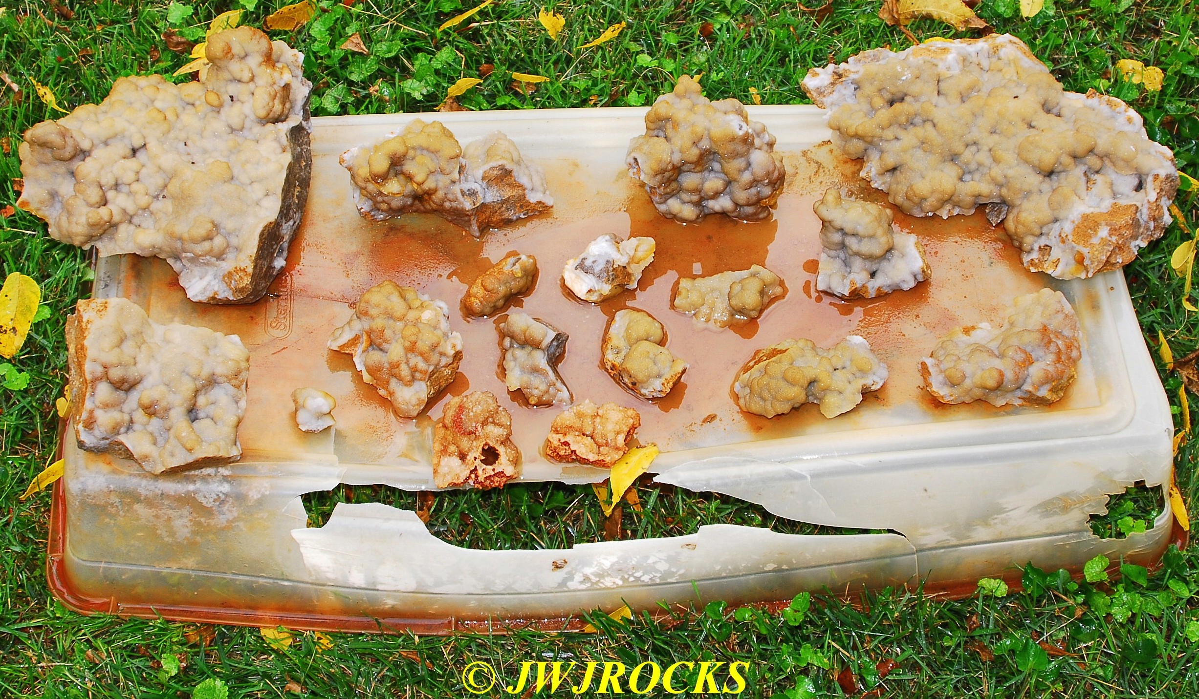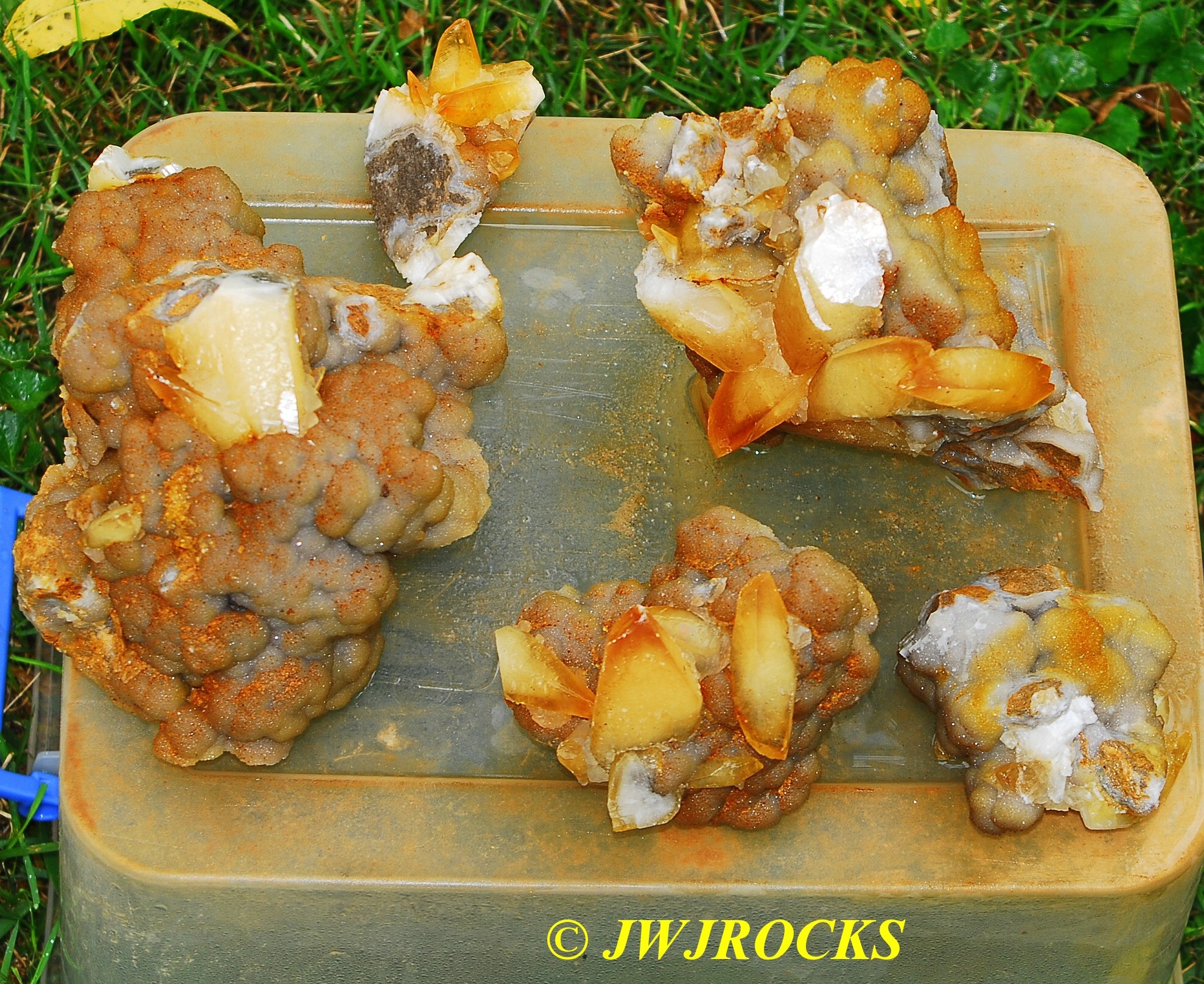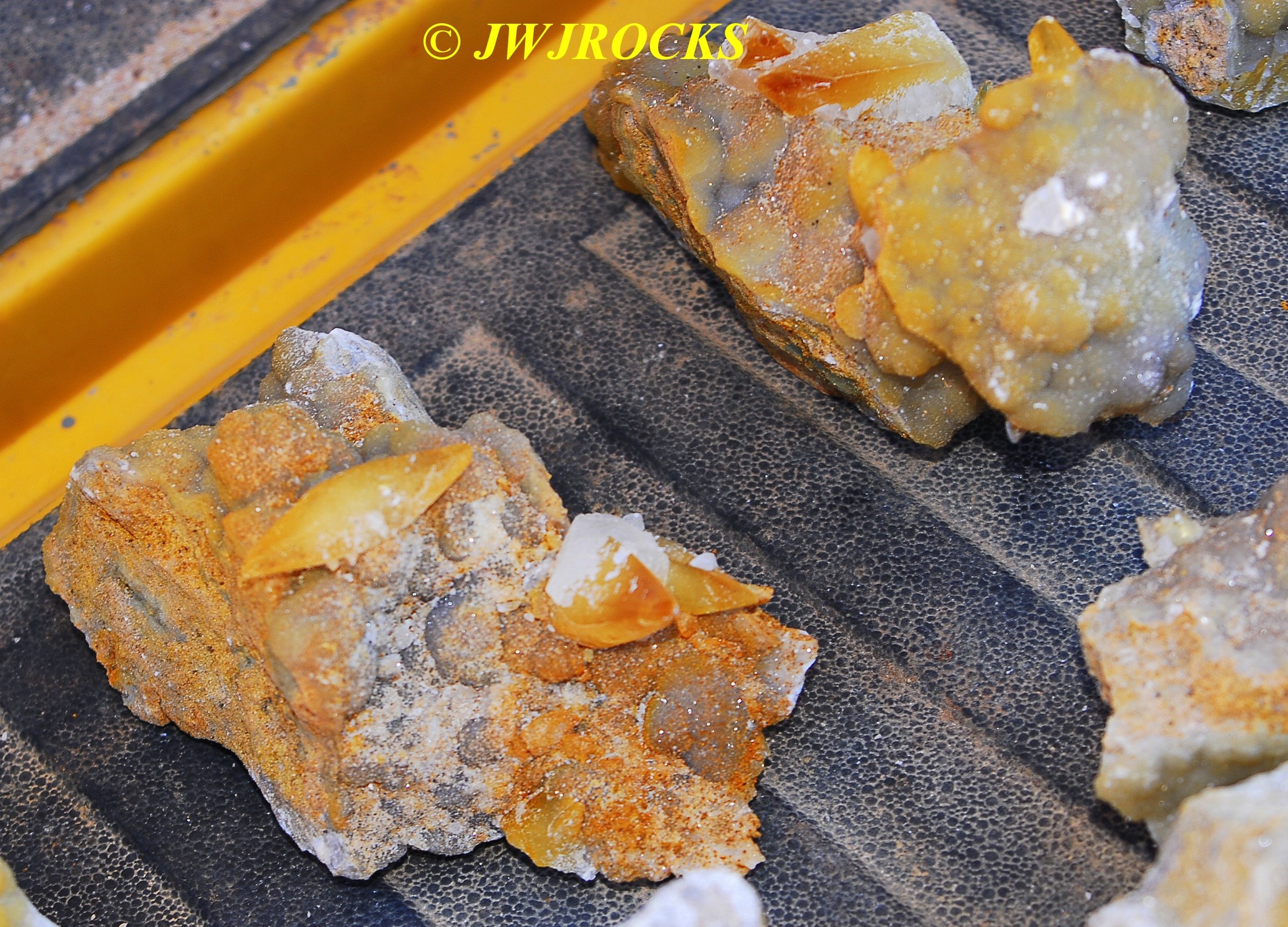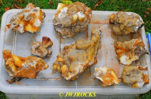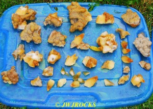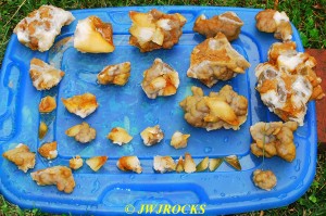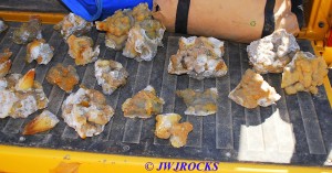and within an hour, I had found a small pocket of poker chips and druse combos…the top three in this photo are the first ones I dug out of the initial pocket in the wall….