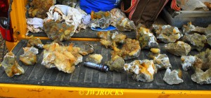 …so I would carefully pull them out, a few of them with the tips already chipped off, likely from either the blast damage, or resulting from the fall from above to their current position upside down in the mix and broken off from impact. Once I had several pulled out and lined up on the ledges of the wall where I could place them, I would pick up the better ones and carry them to my truck tailgate. This would enable me to take a water bottle break as well…and once I had the tailgate lined with them, about an hour later, I stopped to take some photos of the clusters on the tailgate….I set my mini flashlight down by them to give an idea of size reference….