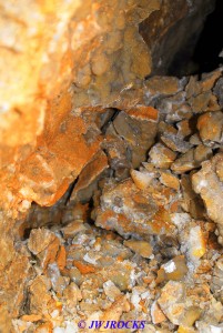 …the next day, I decided to return and clean out the pocket if possible…when I had left Saturday afternoon, the opening pocket was fairly cleaned out but I suspected there was more in the very back, which was a pretty good reach for me…and there was a turn to the right that I could not reach as well. Once there, I decided to knock out some of the rock on the right side that impeded my reach and once I had that out, I was able to reach in pretty good…but I had to hold my flashlight in my left hand and still couldnt reach in with both hands, so I then widened the opening some more so that I could get my upper body inside and then more freely grab crystals and pull them to the area just inside the opening. I laid down a few empty bags to make things easier on me and then proceeded to empty that pocket out as much as I could…