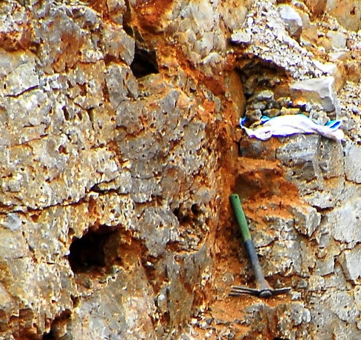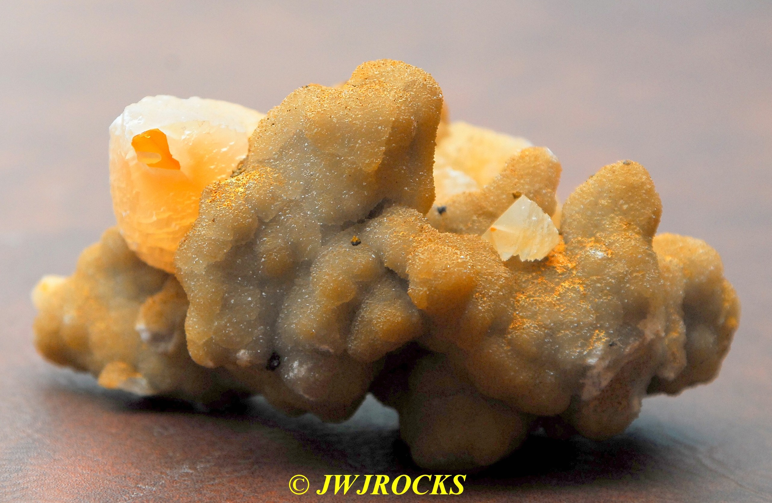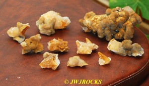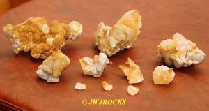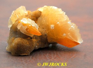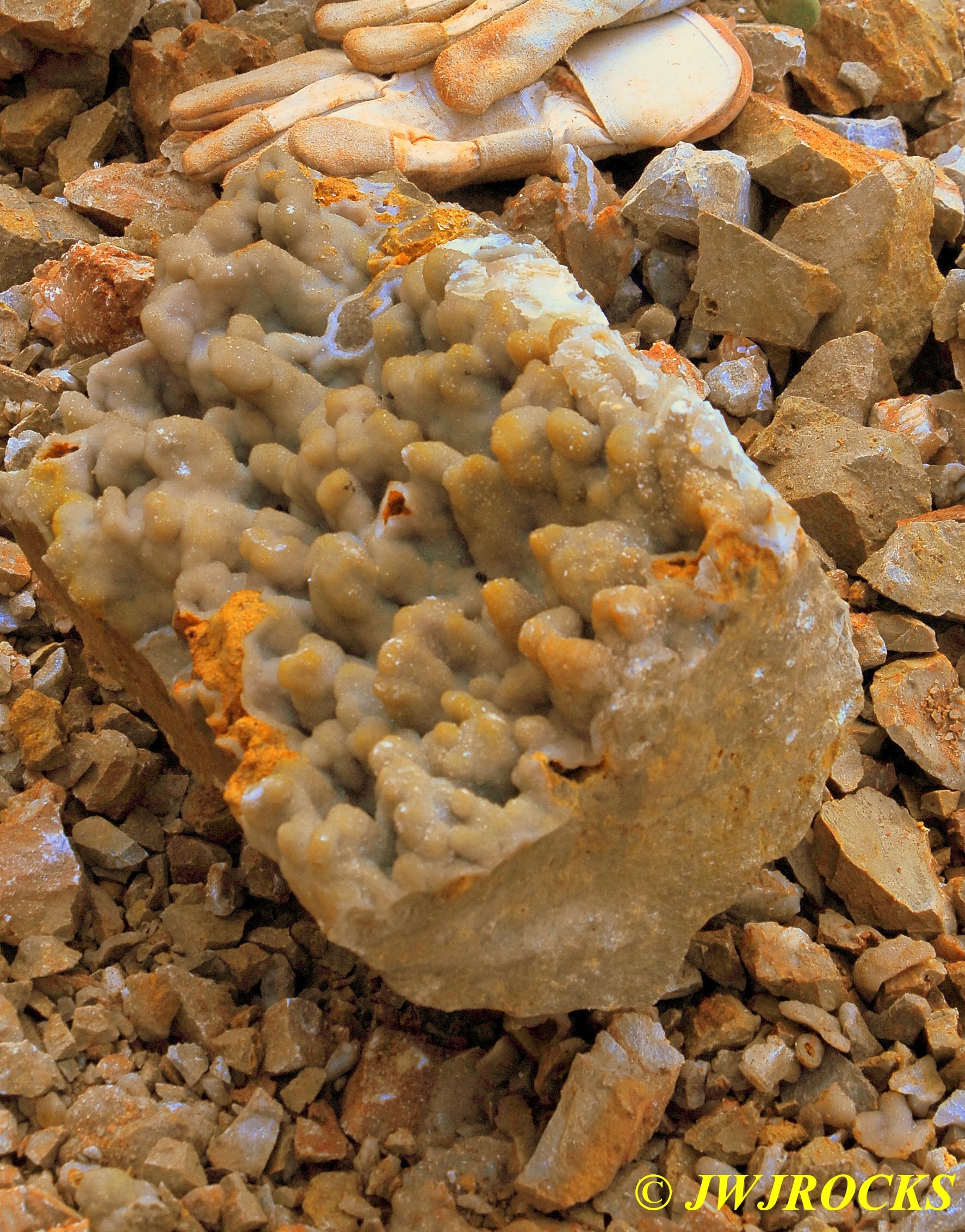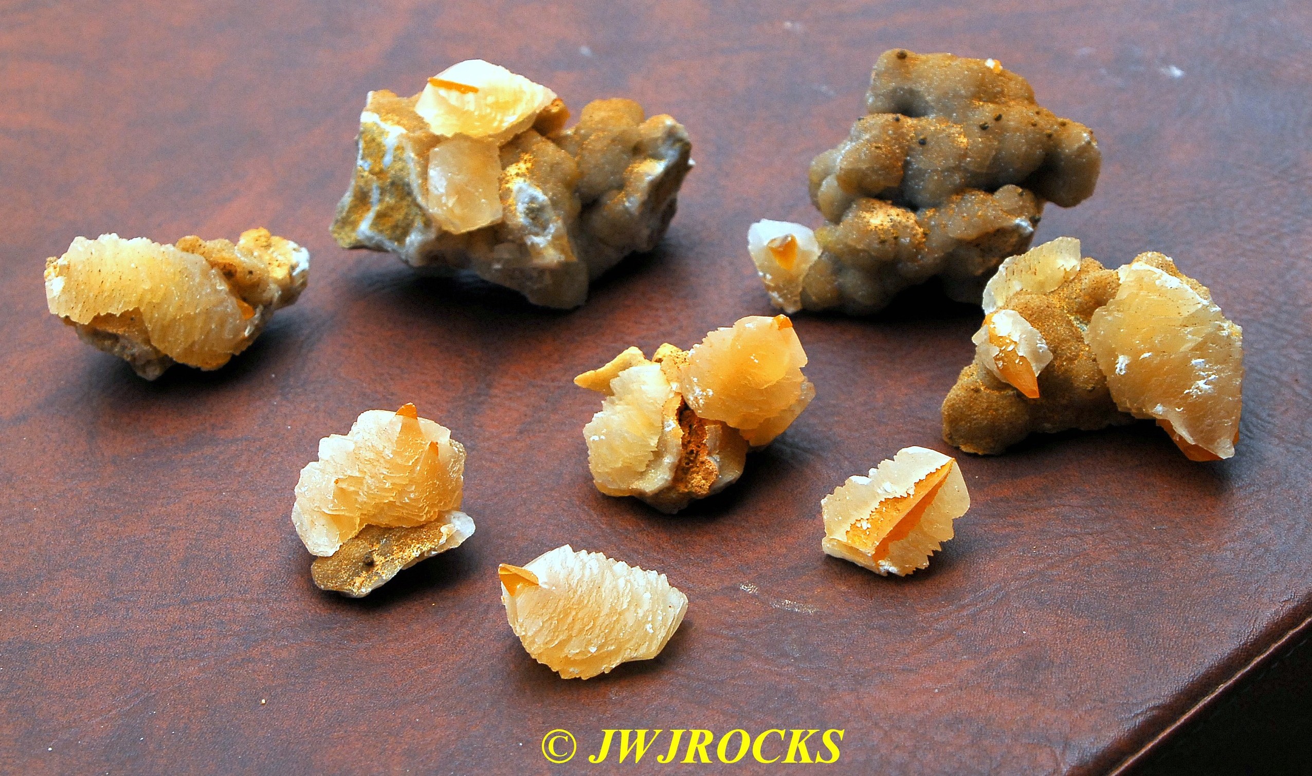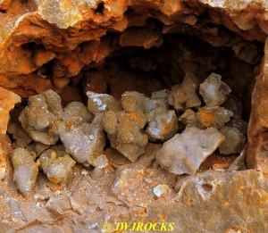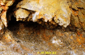 …at any rate, I reached into the small opening of the pocket and started pulling single bright orange dogtooth crystals out and within five minutes, had my sweatshirt pocket full, so I reached over and scraped clean a nearby ledge about seven inches long by five inches wide…and soon enough, I had it completely full as well. I then started pulling out some larger clusters of dogtooths attached to some beautiful bubbley druse…these I set up inside an older pocket located a few feet below that was within easy reach, seen here to the left of my mattox…..
