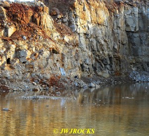 …so I started on down the wall and within about five minutes, began finding some single dogtooth crystals loose in the dirt again…which is exactly the way I found the pocket in September…so I began digging in and sure enough, a small hole opened up. I was standing on a ledge, that measured about four inches wide, two feet up off the gravel sloped floor above the water…you can see it in the photo below, at a forty five degree angle left and below my mini mattox….