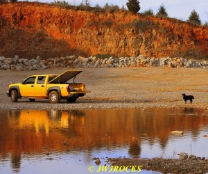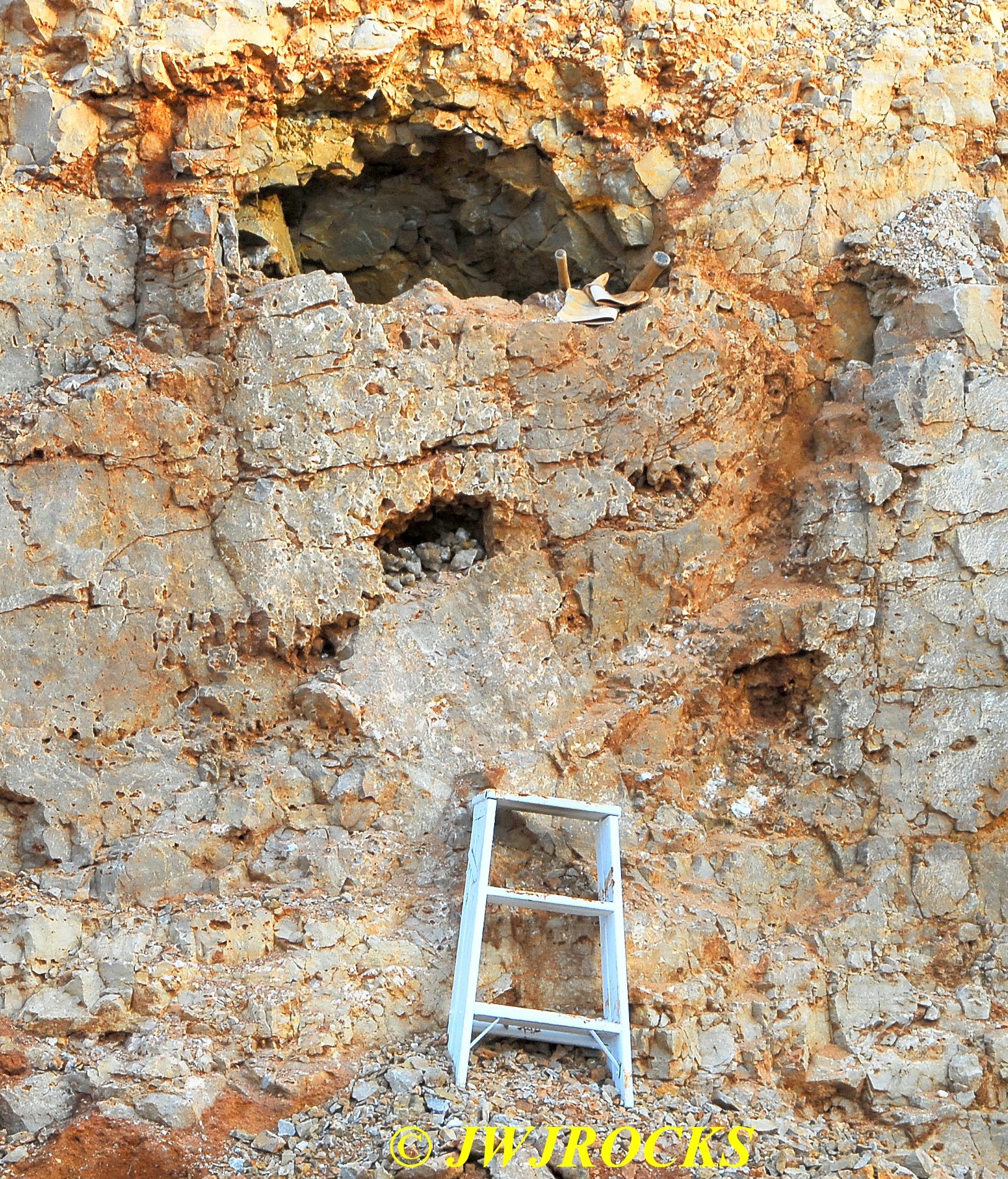 ..removing about another foot of rock, so that I didn`t have to use my hand rake and drag crystals and clusters across the pocket to my waiting hand…possibly resulting in more damage to the crystals, possibly even breaking off tips. The last thing I did after cleaning out the last elements inside the pocket to the very left side, was to remove that huge roof plate I left in there the night before…I had to jam my chisel in and wedge it out, first putting my hand rake under it to soften the blow…by this time, I was out of wrapping cloths and extra bags to do that with. When it came down, it landed on the rake handle, which did soften the blow as planned, and it was all I could do, mustering all of my remaining strength to roll that huge roof plate over and then think about muscling it down that ladder. I decided not to try that part, instead dropping it to the ground, where it immediately stuck into the soft dirt, again as planned. Later when I took one of my breaks, I picked it up, with my legs and not my back, and muscled it across the water hole to the truck….