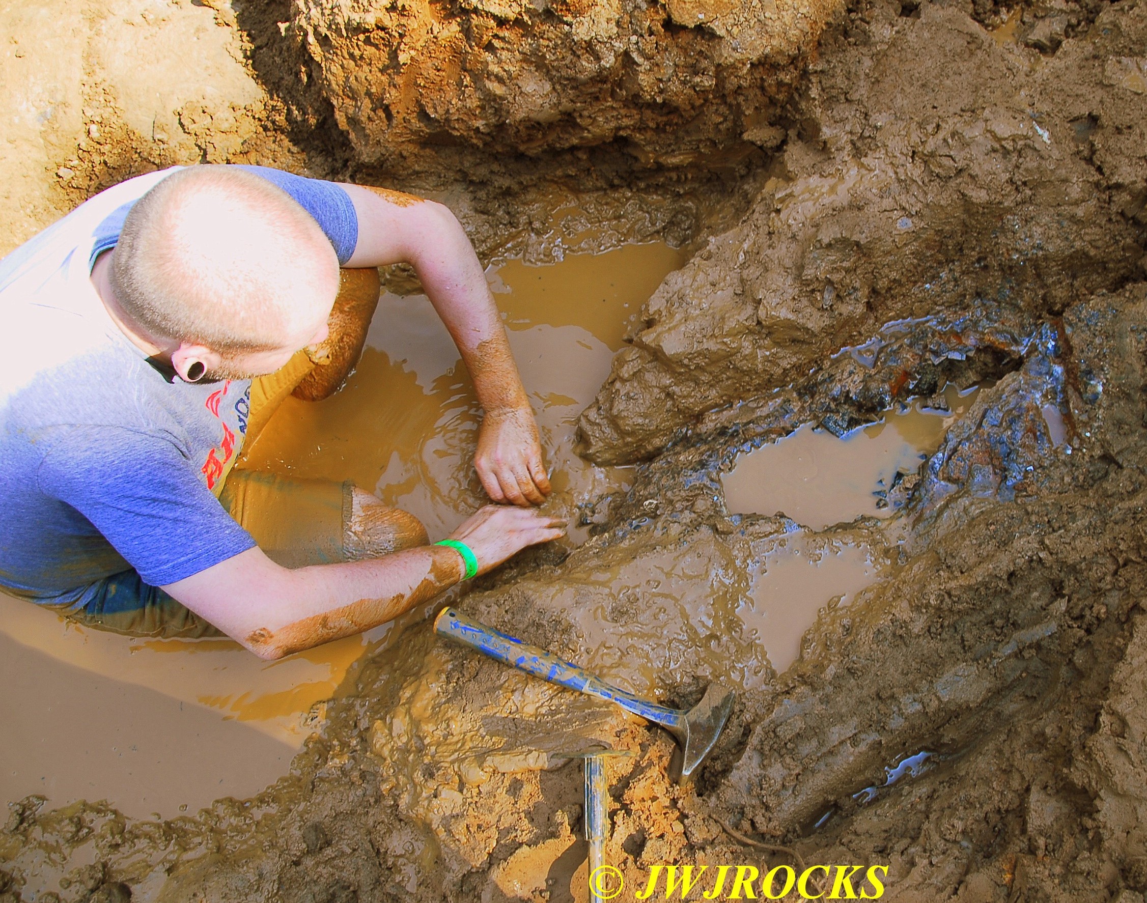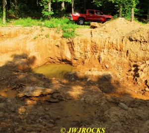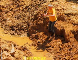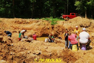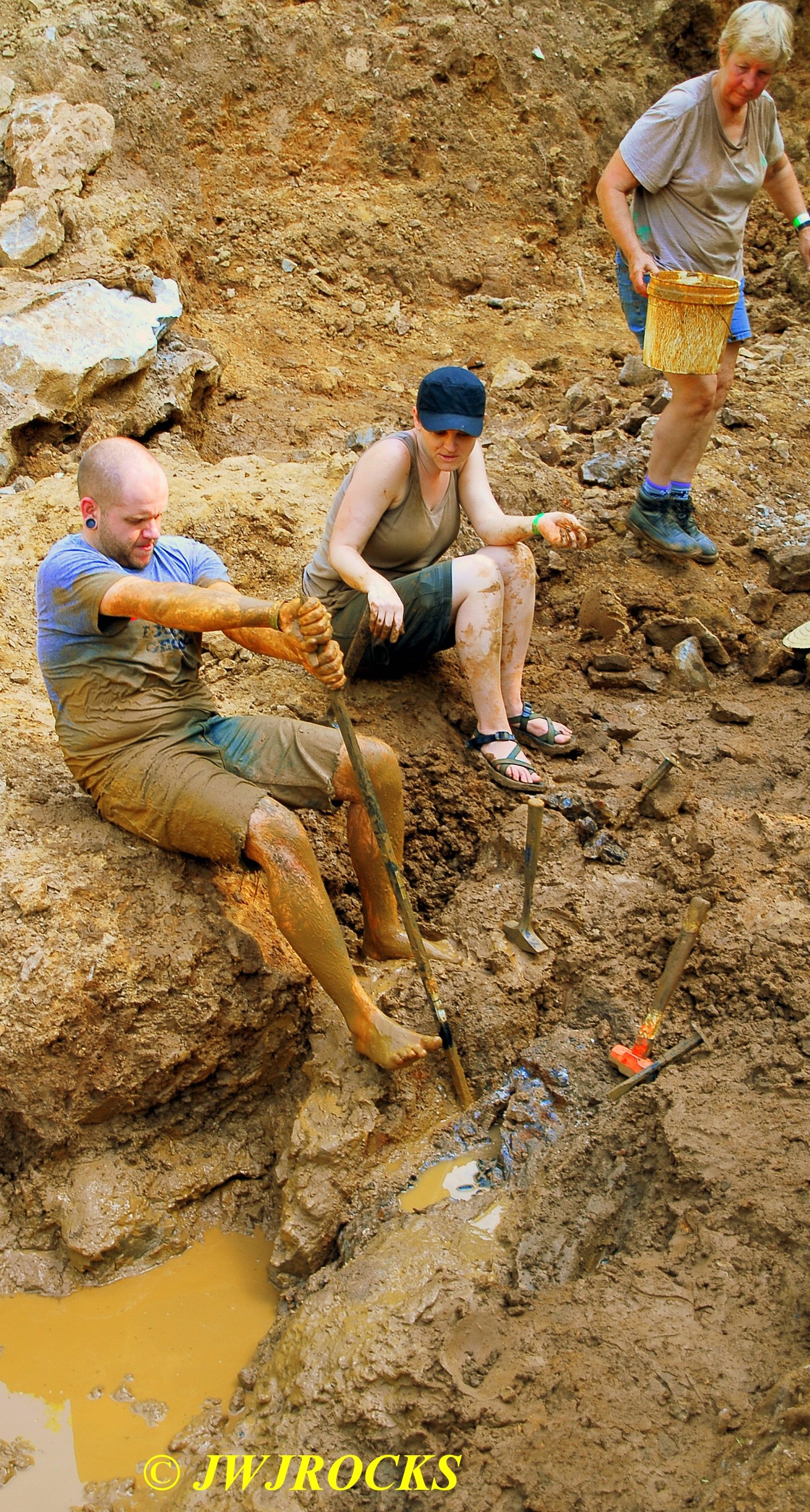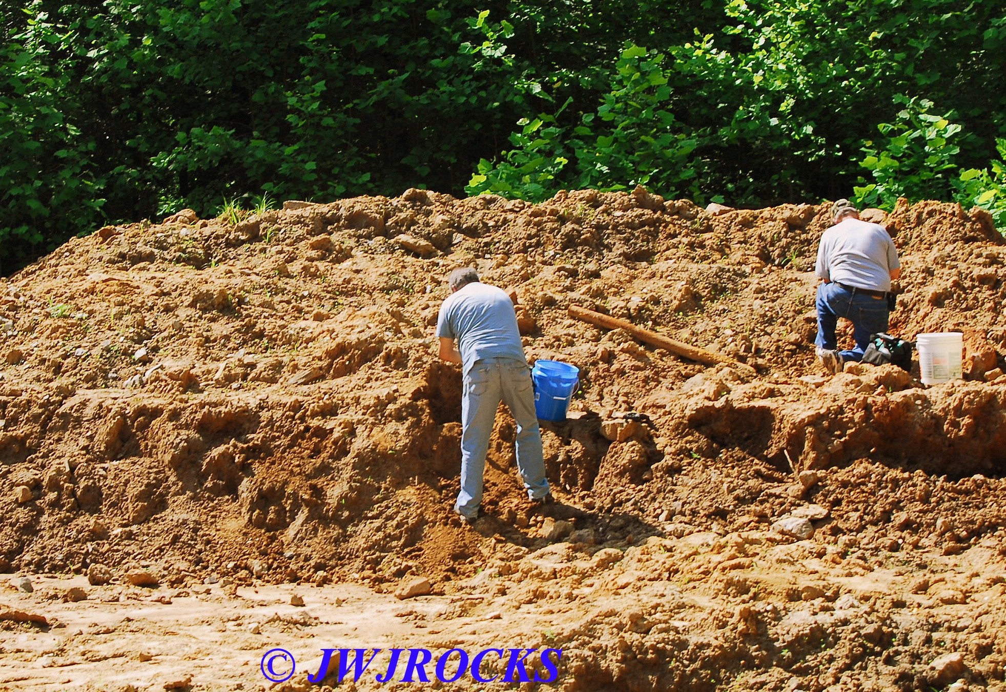 …and about 2 pm, a young couple walked up to me as I was standing on the road over the pit, watching the diggers below and handing out advice when requested…and introduced themselves as Cody and Misty…I had talked to them the week before on the McRocks board website…they are a husband-wife team of geologists who moved to the Jonesboro, Arkansas area to teach geology at the local state college there, and came over to have some fun and find some cubes of fluorite as well. After pointing out the lay of the land there, they chose to get down into the pit and dig in themselves and see what they could find…