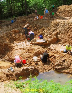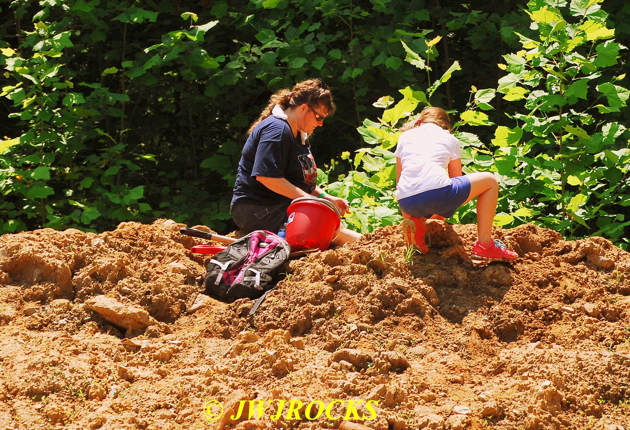 …there were also some areas further up the road on the right side where we had Danny, the trackhoe operator, stir up some old tailings in the woods and some folks found some nice cubes laying on top up there during the day too. By midday on Saturday, there was a family with four little gals that showed up briming full of enthusiasm and ready to tackle anything…their parents sat down up above the new pit and watched their girls go at it, working on the tailing pile removed from the shaft area….