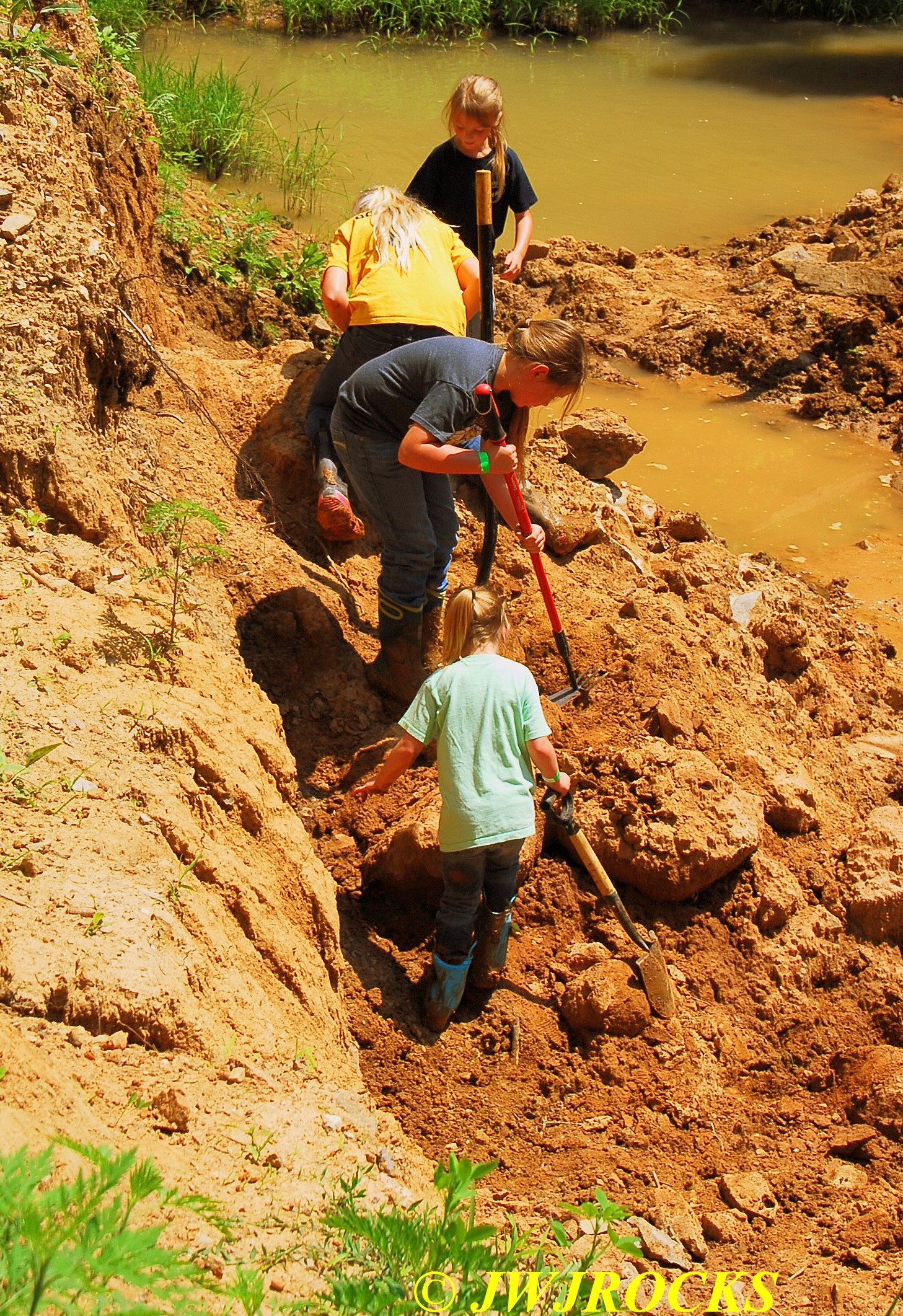 …their Dad told us all on their arrival that this was his work crew, he was going to let them do the manual labor, but later as they became tired, the tables changed and Dad had to get down into the mud to show them what hard rock mining was all about to extricate the pretty stuff. Here they are at noon, giving Dad the bad news….