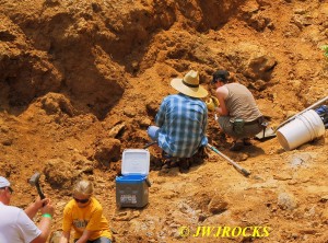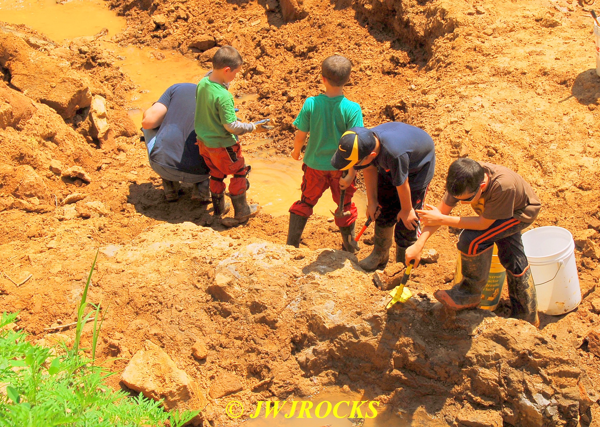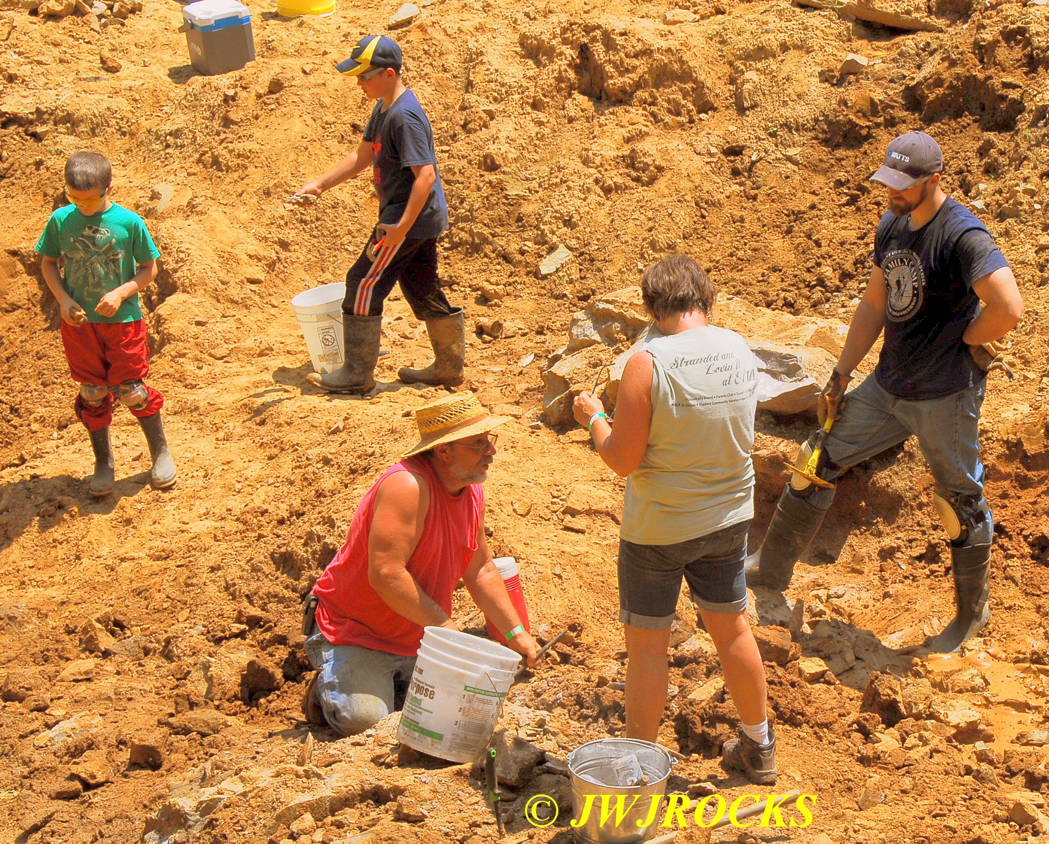 …and a few min later, I got down into the pit to show a young Dad from Wisconsin, where to look for nice cubes along the bench…it was an area where most people had been walking on all day, between a promising looking pocket and the bench…once I uncovered that area, the young Dad revved back up and began looking more closely and trying to find some nice plates for his young son Zach, who was starting out at the age of eight…which is about the same age that I started rockhunting too….once we uncovered the bed of cubes, Cody and Misty came over and helped out too…