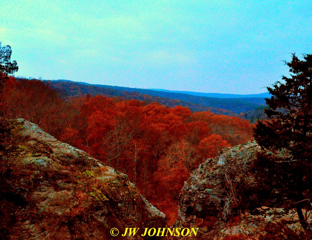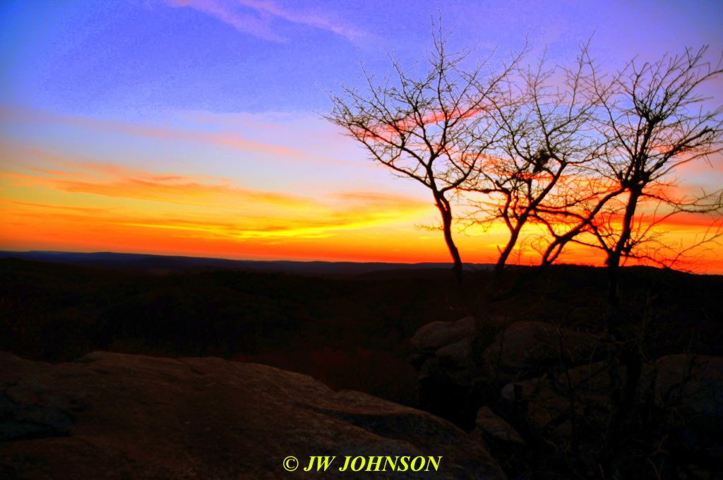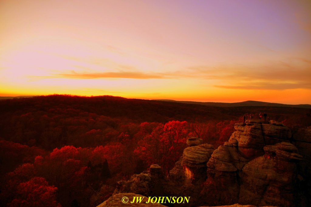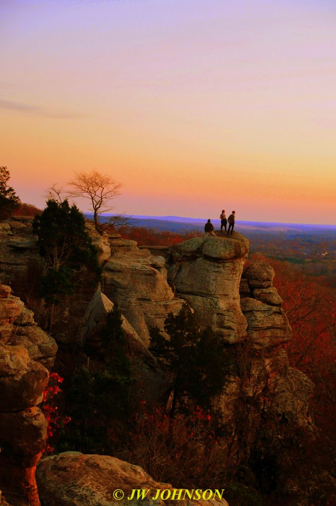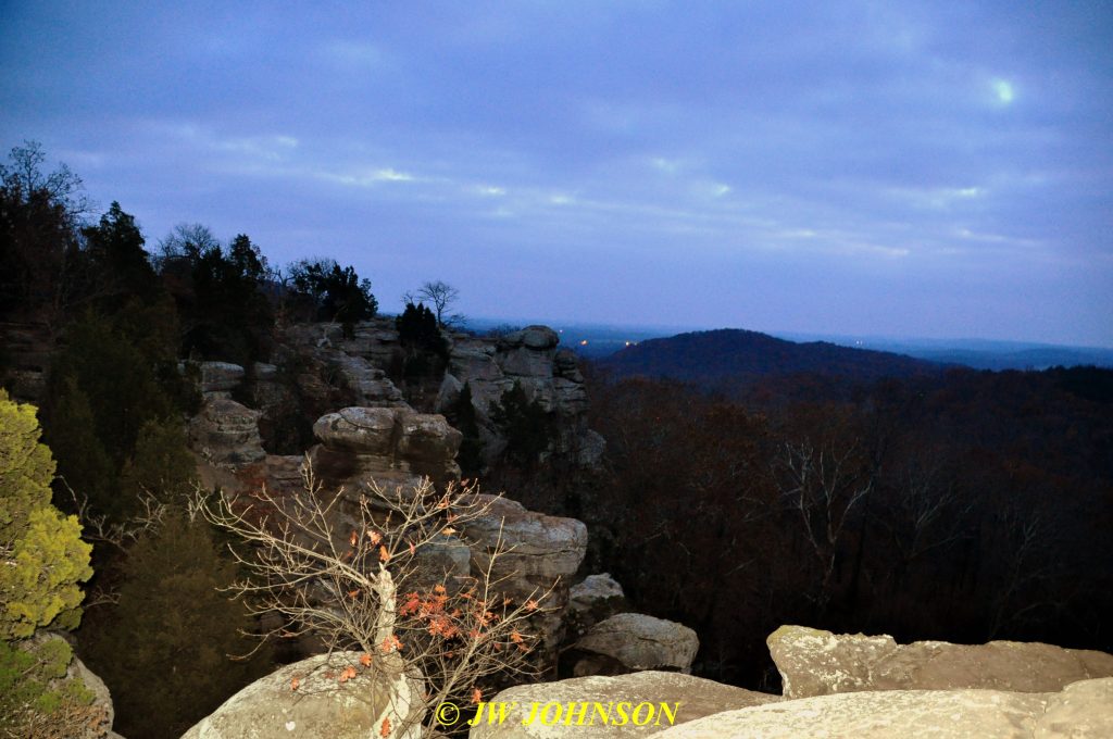 When I began looking at lodging in the area back in October, Chuck and I were able to book the last two log cabins close by, just down the road from Garden of the Gods. Unfortunately there was no pet friendly lodging in that entire area, so I left Onyx with my Mom this trip. It worked out for Chuck to bring his entire family with him, while I was able to offer John Oos and Pete a place to stay as well, since they are two bedroom cabins with a sofa bed couch as well. I also researched a few places to eat at nearby…nearby meaning at least 15 to 20 miles away where the closest towns were located from where we would be, deep in the sticks. Luckily there was a gas station closeby that had a little convenience store and warm food and sandwiches served daily, where we could meet each morning for breakfast. Chuck arrived on Friday afternoon, Nov 25th, about 30 minutes before I did…I was taking the scenic route getting there, going through some of the old coal mining areas on my route, while he skirted around Harrisburg to get there. Soon after pulling up in front of my cabin, Pete called me to let me know he was nearby and would arrive soon…little did I know that he was up on top of the nearby hill at Garden of the Gods, til we all drove up there to catch the last rays of the setting sun and found him at the entrance gate. We got up there with a cloudy sky and just enough light to allow me to shoot a few photos at 400 speed ISO….