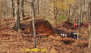 The plan was to meet up with David and Janyce the next morning, they were bringing up their tractor on a trailer to assist us with digging into the tailing piles at the old mine. John rode with me to save parking space at the mine, so we drove over to a local meeting place at 7 am, and after Virgil showed up, we all went inside for some breakfast…the place has a deli inside and can grill up biscuits, gravy, and eggs, plus they have sausage and egg sandwiches too. Afterwards, we drove down to the landowners residence, so he could lead us down to the old mine. I had stopped by to see and visit with him earlier this summer on my way to a dig at the Eureka Mine, and he had offered to allow me to bring my group to his mine and dig into the tailings to see what we could find. We stayed in touch and he decided to let us bring and use the tractor as well. He led us down to the location and helped us with parking, directing David to a flat spot so it would be easier for him to unload the tractor. After introductions, we all gave him some nice crystals and minerals from our respective areas and he then showed us where we could dig and hazards to avoid, and soon after we had all spread out all over the huge tailing pile in front and began there…I brought a rake with me and used it to rake down the heavy carpet of forest leaves from the pile…John had offered to bring a gas powered leaf blower to make things easier, but I told him it would take up a lot of room in his car, and possibly deprive him of space in case we hit the jackpot in goodies there.