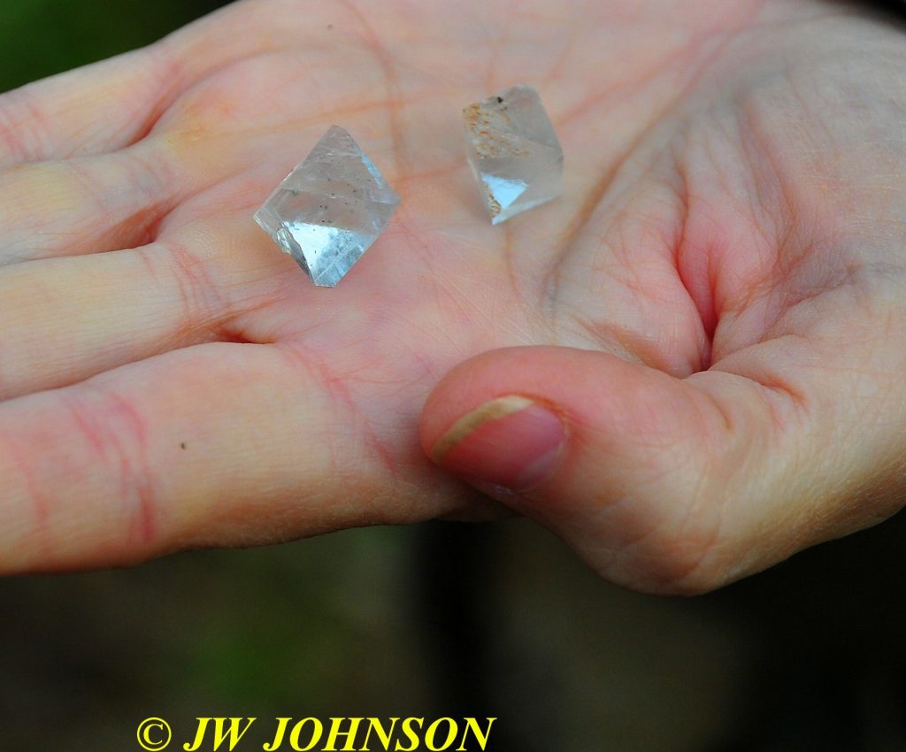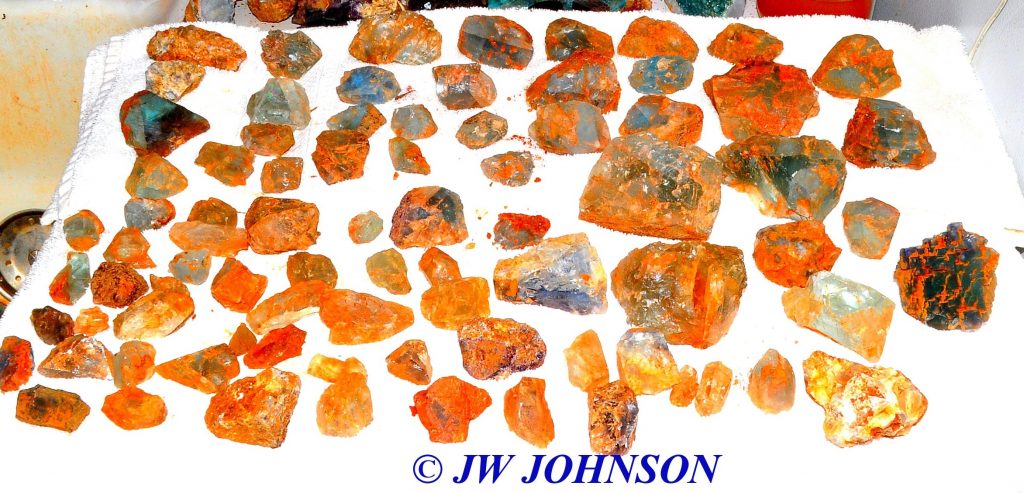 David left the tractor and trailer with us at the cabin, so the next morning they arrived about 7 am and then we all drove down to the local meeting place for breakfast again. After arriving at the old mine and digging for about an hour, still finding alot of blue fluorite pieces during that time, we decided to stop and head over to Etown and visit with Gary, who mines fluorite in yellow and purple colors nearby….Gary also sells the fluorite and makes octohedrons by hand as well. I met him and his son at the Eureka Mine Show earlier this year and found out they have some beautiful stuff that they sell by the flat. David has bought from them as well so he and Janyce led us to Gary`s house. Gary had several pallets completely covered by purple and yellow fluorite, plus he had some raspberry colored fluorite as well, so we all grabbed a flat and started selecting what we would like to buy from him. While we were doing that, he chipped out a couple of octohedrons for Janyce….