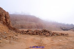 We got on the road about 7:30 and an hour later, the fog was starting to lift with sunlight burning it off. Thirty minutes later, the skies finally cleared off and remained that way til we were within two miles of the quarry, then the fog enveloped us once again all the way to the quarry. We arrived soon after to find Chuck sitting on a rock up on top of the blast pile, cobbing down a boulder and wrapping up specimens to put into his bucket….