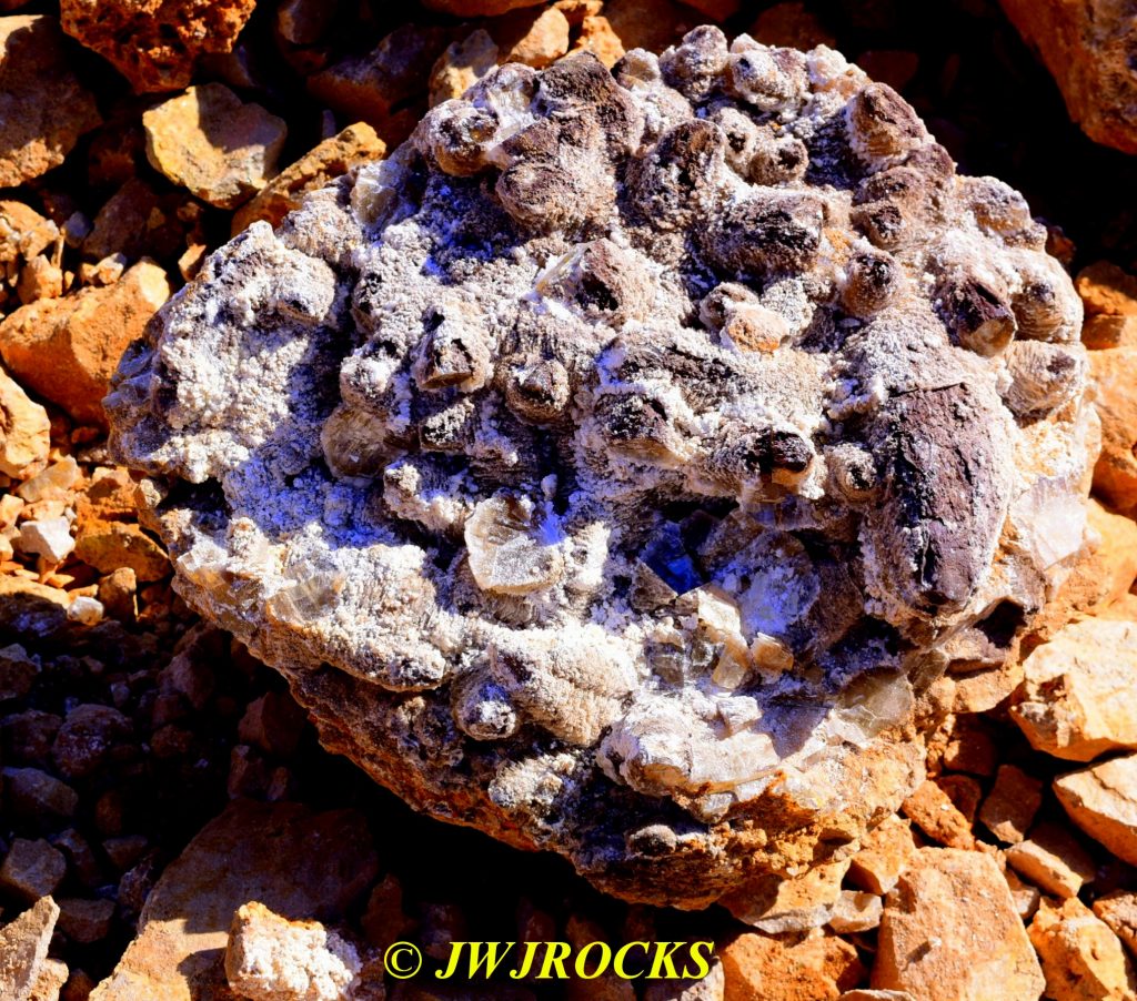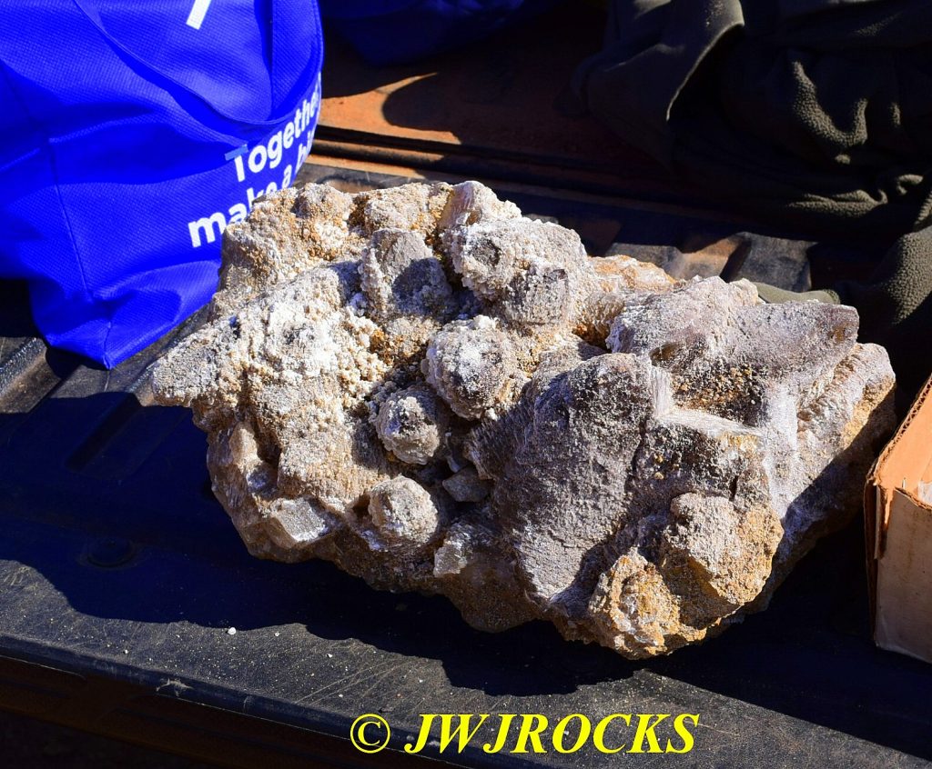 In the meantime, Nathaniel started shouting to us that he had found some huge yard rocks and some nice smaller clusters over on the west side of the pile, some of them covered in what looked like aragonnite….here they are on my tailgate….