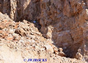 By this time, I had three bags completely full of wrapped crystals as well as three large clusters that I had no room for in the bags, so had to make two trips down to the truck, where I took a short water break, got Onyx some more water in his bowl, and then took another bag with me, back up to look along the wall for more pockets. When I got to the top of the pile, I located more pockets and soon after, Chuck and Nathaniel returned from their exploration break. Nathaniel joined me up on the top wall where I had located four pockets close together. I worked one pocket and let him have the others, as I was beginning to tire already….before heading out, Chuck grabbed my camera in the truck and snapped a couple of Nathaniel and I working the wall too….