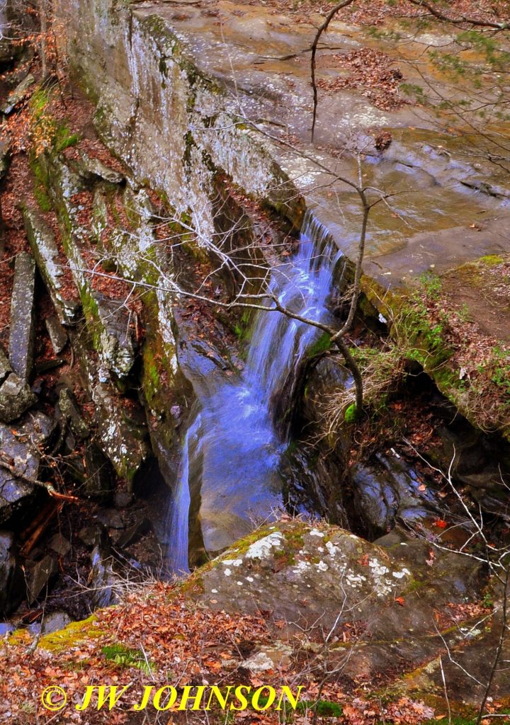 As you can see, he had some very pretty and unique pieces in his grandfathers collection, over 100 pieces, many were of the barite clusters, which I had never seen before as something coming from the fluorite mines of Southern Illinois. I have to say I was a bit skeptical that the large quartz crystals and two smaller quartz clusters came from the fluorite mines, especially the smokey quartz crystal..mainly because they resembled Arkansas quartz crystals, but he pointed out two small quartz plates, both of the type commonly sold in the spirit quartz genre, and he told me that he had purchased those somewhere because they appealed to him. It was verified to me later that day, that indeed, smokey and clear quartz crystals were found in several of the fluorite mines in the Rosiclaire area. I made an offer to him and he accepted it…while his collection was not extensive, he had to sell it due to moving to another house soon and no room for it there. I did leave him with a few key pieces with great sentimental value that tied him directly to his grandfather. After wrapping up each piece and loading them into the cab of my truck. Onyx and I headed down to see and photograph some waterfalls that I had heard about, also located in southern Illinois. Burden Falls is located in the National Forest about a twenty minute drive south of Harrisburg, just west of Hwy 145 on Burden Falls Road…if there has been heavy rain in the area and one suspects the creek feeding the falls will be flooded, one can also come in from the south on Water Tower Road, which merges to the right with Ozark Road after a few miles, and then you make a right turn on to McCormick Road/Burden Falls Road. The creek runs across the road and the first set of falls is just a few feet from the creek crossing on the north side…