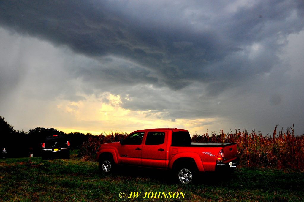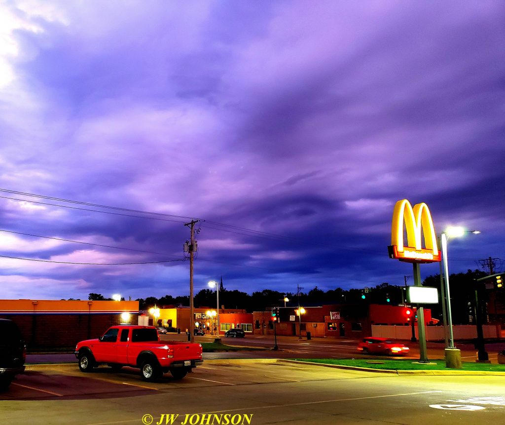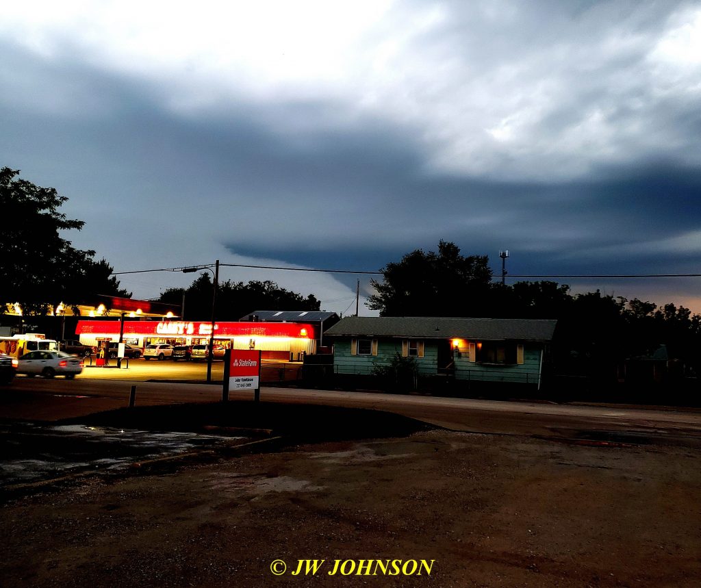 By the time it started to get dark, the crowd had thinned out considerably and we were getting hungry, so the consensus by many was to go up to the Hamilton Cafe and get some supper. Charity and Jamey were the first ones to wrap up and head out, followed by Marv, one of the John`s dealer friends from Cedar Rapids, Robert, Dennis, and John, Chuck, and I. Just as we were getting ready to head out, we heard the tornado sirens going off across the river in Keokuk, then the alerts came across our cellphones for a storm just southwest of Keokuk with a doppler radar indicated tornado. We drove up to the Cafe and most everyone walked inside…I stayed outside to shoot the storm…we were up on a hill and there was a pretty good view to the west and north from the parking lot. There was a local firefighter out in the parking lot with me, he and his family had just finished eating supper at the Cafe and were preparing to leave when they heard the sirens and saw the alert. They decided to stick around with me and watch the storm for a few minutes…he was taking photos of it as well…