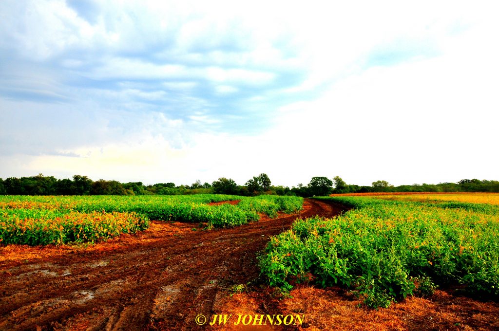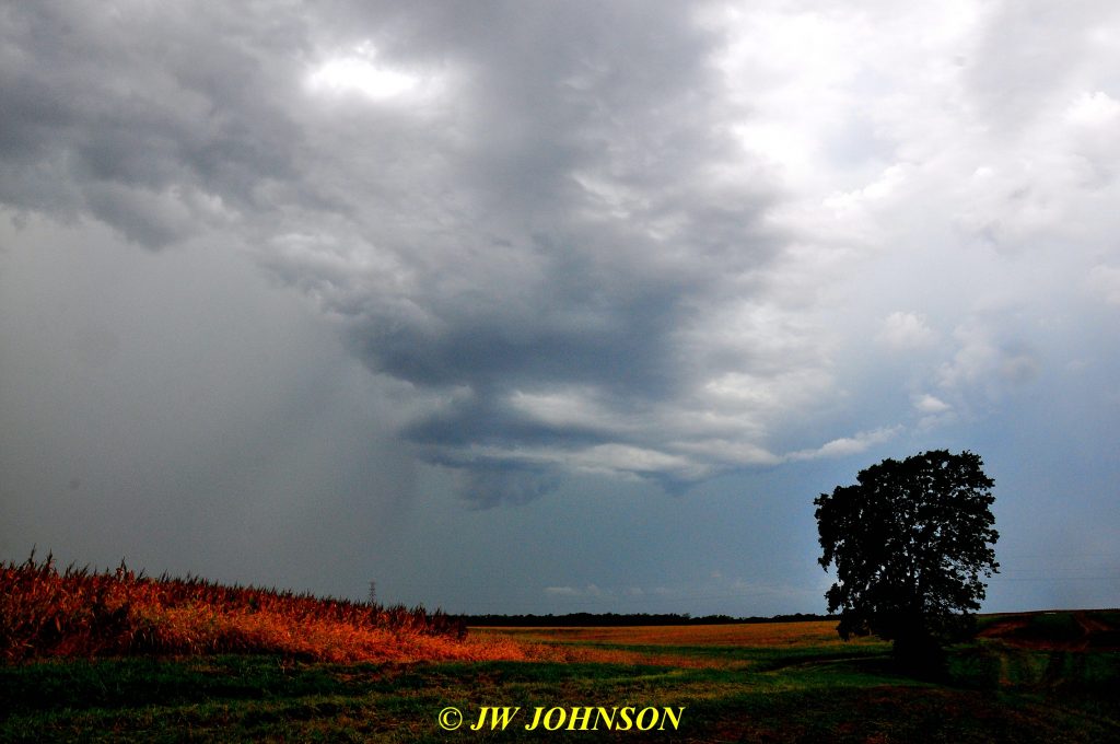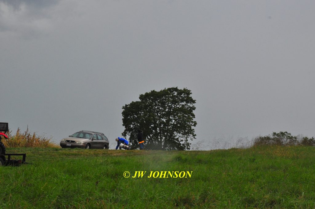 We all followed our guide out to the site known as Rod`s Geode Site, or Rod`s as most of the hard core collectors call it…a couple of miles south of Hamilton, where we turned off on to a nice white chat gravel farm lane that led to a farmhouse and outbuildings at the end of the lane…or so it appeared. However, once we topped the low hill above the highway, we soon turned left and drove down a dirt lane thru a soybean field…I thought to myself as I turned, ” I sure hope we don`t get any rain showers or this will be a lane of pure sloppy mud when we come out “. John told me before we left, to park on the right of the field near the cornfield, which would be the high point of the hill, to avoid getting stuck…his advice was mainly for those driving cars…I have four wheel drive and have never got stuck in my Tacoma yet. Grant and I parked at the bottom of the hill, at John`s direction once we arrived in the right field, he said it would be a much shorter walk with the anticipated number of buckets we would have. Now, remember, it was fairly dry when we arrived there, the grass wasn`t wet because the earlier storm passed way to the north of this farm, so there were no worries when we parked down there. Here is how the sky looked when I pulled over at the top of the field hill by the cornstalks, to allow others to pass me by and park in the next field over…
