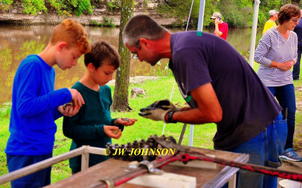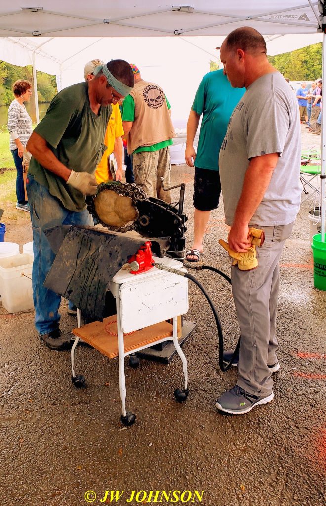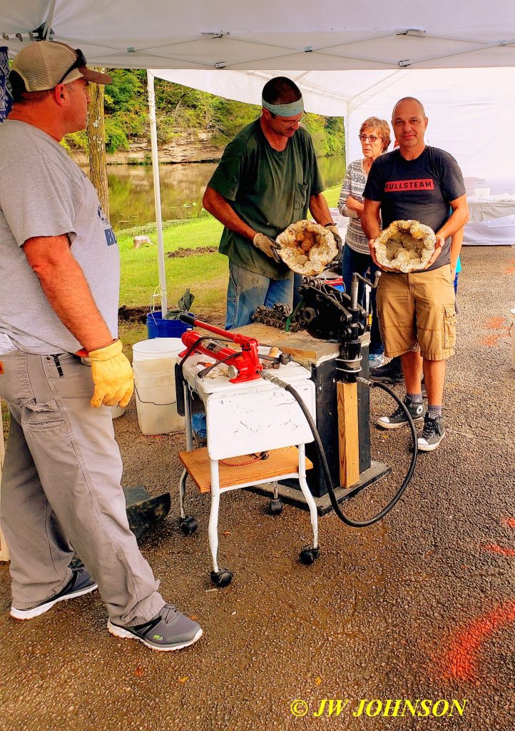 …that storm did clip us as we received a good shower soon after I arrived, but the main part clearly passed to the north of us. I heard later at supper in Keokuk that it was a pretty serious thundershower in town that morning. I walked over to visit with my buddy John O, who was setting up his tent booth, getting his geode cracker out and ready to crack geodes later for folks who found them. John is a self taught geologist and has been a tremendous help to the folks who have run Geode Fest each year for the past several years, he donates alot of his free time to help them with location scouting, location prep and physical clean up work to get the locations ready for hundreds of rockhounds to descend upon, and he assists with logical thinking when it comes time to set rules and policies as well, and he never charges them for his time and assistance, either.