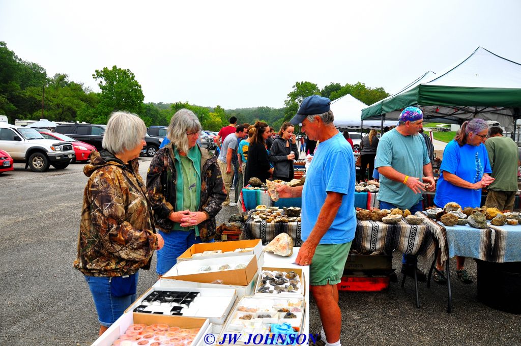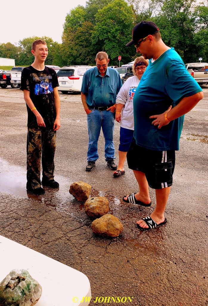 Throughout the afternoon, I visited with dealer friends, Dennis Kossow, Charity and Jamey, Robert Kuhn from Hot Springs, Arkansas, and met a few new ones as well, and we had rain showers and a few small storms all afternoon and into the evening hours. Chuck arrived about 4 pm and started helping John crack open geodes for folks who were successful finding some big ones earlier that morning and some who braved the afternoon storms to find some as well….