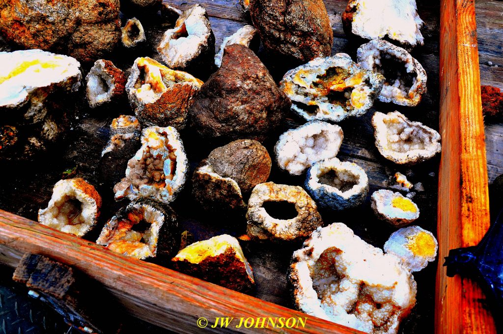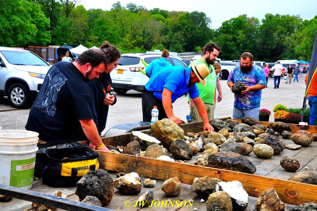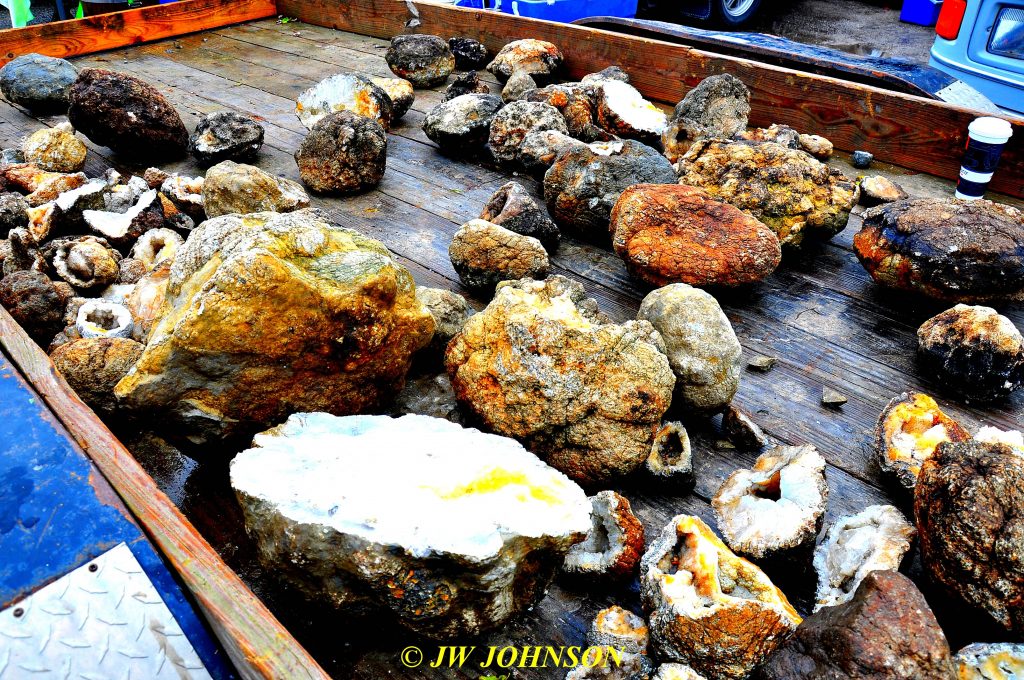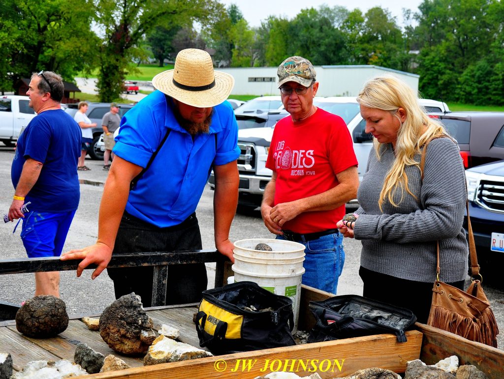 If you have never been to Geode Fest, it is quite an operation to behold. Years ago when I first went there, it was held on the Keokuk side at the Hy-Vee Grocery parking lot, but it soon outgrew their side parking lot and they moved the event to the Chaney Creek Access parking lot under the vision of Mike Shumate who was in charge of the event back then. Mike is a good ol country boy who is also an avid collector of geodes for many years as well as a wealth of information for the area and geodes in general. Rockhounds are allowed to pre-register or bring their paperwork with them to the event and then pay their fee for the entire weekend. Once you register and pay your fee, you then move to another booth tent and sign up for sites/location you want to dig or collect at…in years past there have been six to ten sites available to go and collect at. There are two locations available on Friday and Saturday, Sunday is a morning dig only, so for your entry fee you get the opportunity to go dig and collect at five sites/locations. For each bucket you fill up with geodes to take home, you pay an extra $ 25 to your guide and that money is given to the landowner of the site/location you went to dig/collect at. You sign up for the site/location you want to go to each morning and each afternoon starting at a pre-designated time. Your guide is determined ahead of time and he or she has a certain colored flag on their vehicle, you are notified of the flag color when you sign up for the site/location you want to go to, and then they announce on a public address speaker when that guide is lining up to head out to that site/location…they give you about 10 minutes to line up…and in that parking lot, it can be hard for everyone to line up in a single line, due to the haphazard way that some people park there…some have no respect for rules, no respect for lines, no respect for others….some park out in the open where there is no parking and that can cause folks to be blocked out completely…it can be really frustrating to say the least, in getting into and out of, that parking lot !!