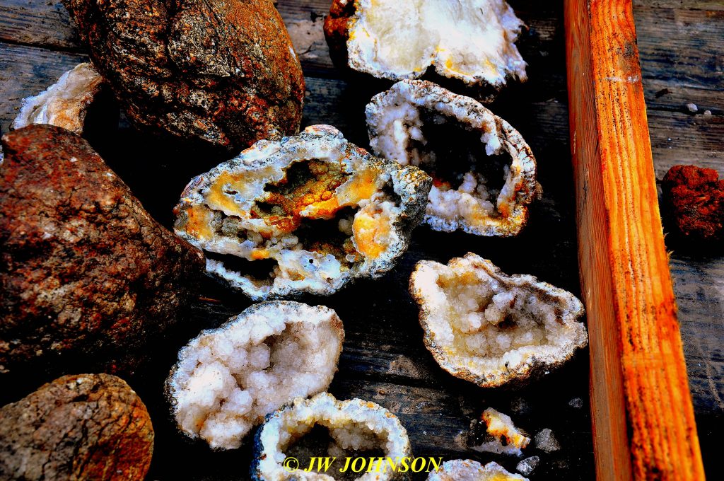 This year I walked down to the lower area of the plant along with a couple of the older members to search the dirt and weedy area for geodes…we found a few halves that were pretty, but the whole geodes down there seemed to be mostly solids…like 99 % of them were solids, so we left them right where we found them…the agates we found more than make up for those. 🙂  John had his geodes from Josh`s riverbank cleaned up when I got back over to the parking lot to say my goodbyes and see you later`s to everyone….