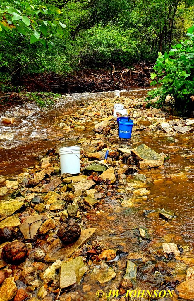 John was working ahead of me in the creek, checking both side banks for geodes…not finding many around the banks themselves, so we checked the ones in the middle riffle instead. We found a few that felt hollow but many felt solid..keep in mind we were looking for snowball geodes, so some would have a bit of weight to them, but not so much they would be solids, so we were working a fine line here. John has more experience with snowball geodes so he was a good judge of weight of them…needless to say, we didn`t find many that held up to his standards even. From here, with a few geodes in our buckets, we decided to go back toward the entry point and check the long riffle in the middle….