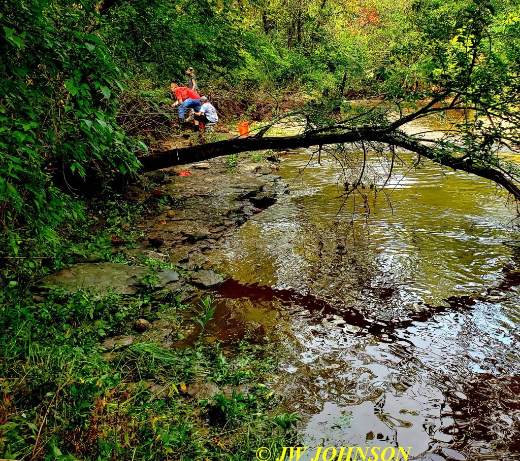 …he had wisely put his blue slicker on and once he reached the bottom of the hill with us, we all headed down the trail to the creek…everyone but Grant and his kids, who were now fighting among each other over tools and buckets…so we just left him to referee and we booked on down the trail to get ahead of others and get to John`s sweet geode spot before anyone else did. I had figured that it was gonna storm on us, after seeing the storm on approach to us, so I had put my raingear on, but did not take my camera with me. By the time I got my gear out and caught up with John, we were at the third crossing for Railroad Creek, and from there we had to wade downstream. I had the wrong boots on for wading, but figured I could always replace them at the Walmart store across from my hotel. We were looking from bank to bank as we waded down the creek, picking up some here and there along the gravel bars until we finally reached a spot where trees were down and crisscrossing the creek in a tightly congested area. This was the sweet spot  and just as we started seeing geodes sticking out of the bank on the far side and began to pull some out, the heavens opened up directly overhead and rain began to fall…monsoon style…like someone turned on a fire hose above us…THEN someone turned on the drums of thunder above us and the lightning bolts started zinging all around us. Shell bolted back up the creek to check on the kids and Grant, and another gal joined us looking for geodes. John and I decided to get out of the water while the bolts were flying all around us…the gal stayed right in the water despite our suggestion that she get up on the bank. Turned out to be one of the longest storms I have ever stayed out in…after twenty minutes of intense lightning, thunder, and heavy rainfall, realizing I had a bucket nearly full of geodes, I let John know I was gonna head back to the truck. I trudged back upstream thru the creek, picking up a few geodes along the way…and met a few others that had decided to stop and at least take a break as well. Just as I emerged from the forest to the edge of the field near my truck, I met the guide who asked how many folks were down the trail I had just walked up…I let him know that at least fifteen people were still down the trail and in the creek at least a quarter mile down, including John O. He said he had received text messages from the Event Parking Lot warning us that a huge storm was approaching…I asked him how long ago those messages were sent, he said it appeared that they had been sent before we arrived but the storm apparently bothered the signal and delayed the reception til after the storm hit and hit HARD. At any rate, they were requesting everyone return to the parking lot. Grant came walking down the hill and said folks were trying to leave up above and were getting stuck on the dirt lane of the soybean field, he said it was a real mess. He soon went walking back up the hill. The guide went down the trail to deliver the bad news to the rest of the rockhounders. Shell came out of the woods with the kids and they began to load their tools and geodes into the bed of the truck. I helped her with the heavy stuff and then I drove up to the top of the hill to see what was going on. I paid my bucket fee to the assistant guide and then drove down to the gully before the soybean field…there were folks there that told me how the dirt road was, they had already been up it and back…..