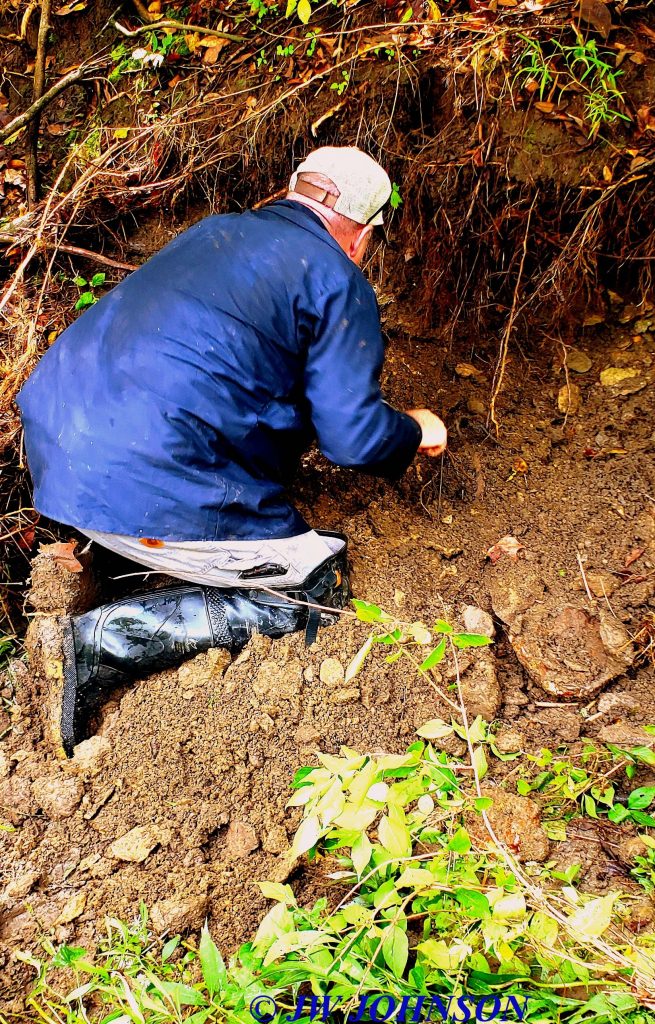 As soon as we reached our entry point to the creek, we started seeing more rockhounds, some who had arrived soon after us and more that arrived with the larger group…they were spread out up and down the creek, some with waders on so they could access the deeper wading pools and some in shorts and tennis shoes to stay cooler…John led Chuck and I down to one of his secret spots where there was a flat grassy area and soft dirt bank to dig into…