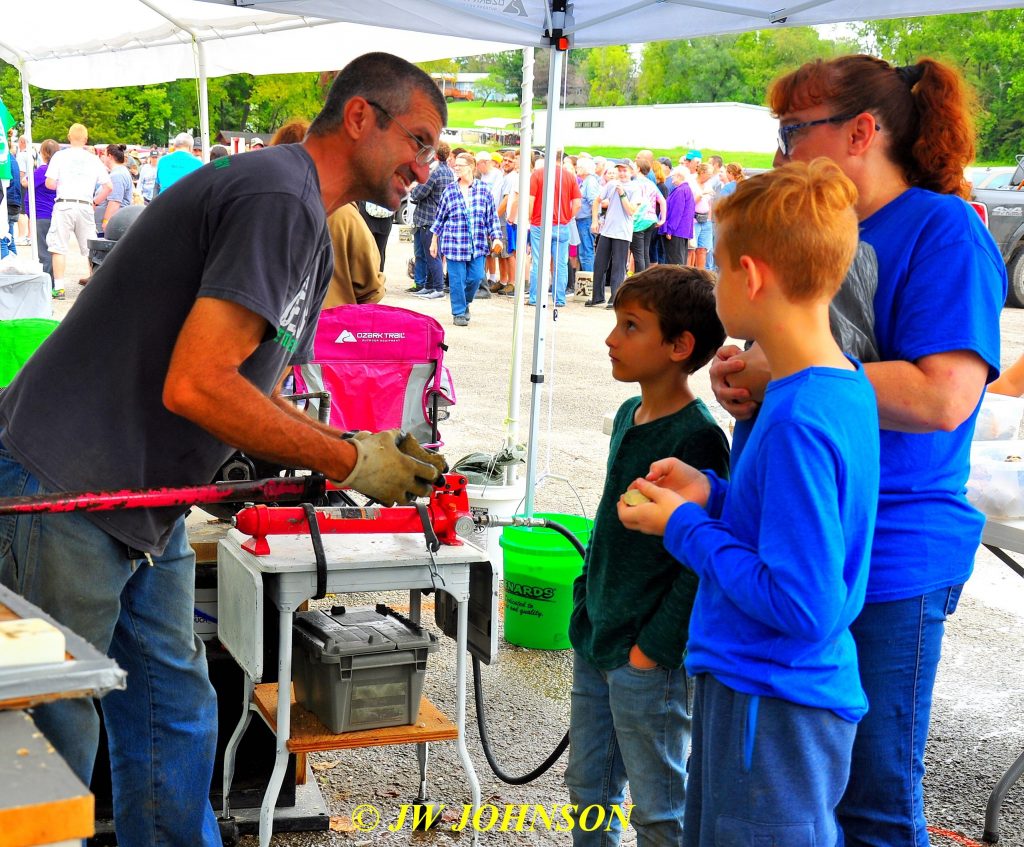 I talked to him a few minutes between customers about the engine set up…they are part of the Amish community that does not use electricity, and those big ice cream churns are way too big and heavy to turn by hand.  One of the other Amish lads there was Amos, he brought the trailer load of geodes up there that morning, said the Fox River, which runs through the property of his farm and the other two Amish farms nearby, was bank full…these were geodes they had previously pulled out of the river and saved for a rainy day….Amos is the big guy in the beautiful blue shirt and straw hat….
