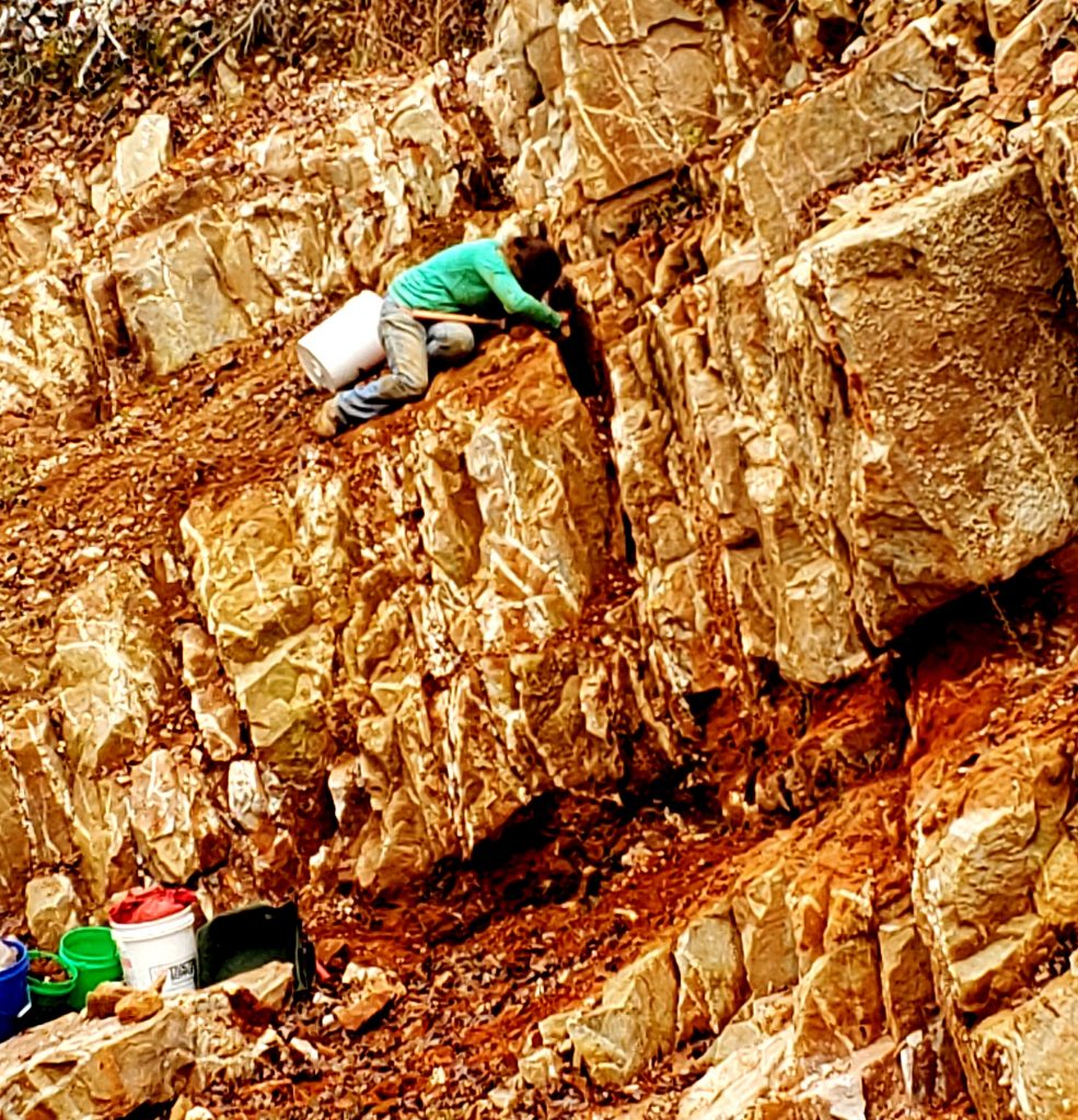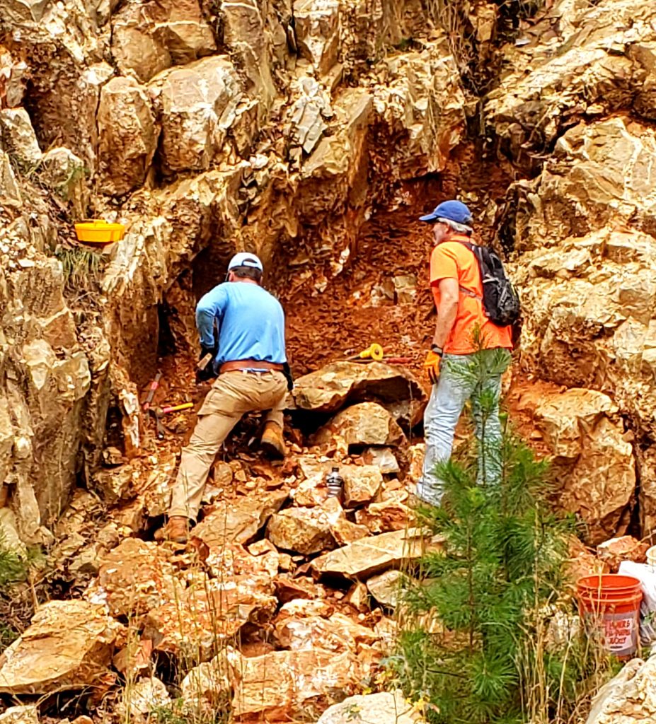 Patty, Colby, and Gabriella worked the short wall the left side of the newer pit on the left side, at least they started out there and we were all looking for some signs of a crystal pocket…when we all spotted something, we simply dug in and worked to pull crystals out…Patty spotted some crystals in a small pocket up high on the rock and had to twist and contort herself so as to get her arm into the pocket to pull crystals out…she is a real trooper tho, she worked that pocket pretty much all day to harvest quite a haul in crystals…