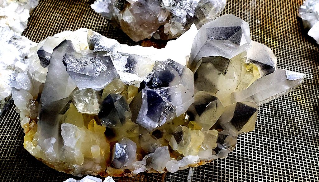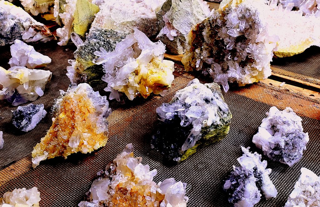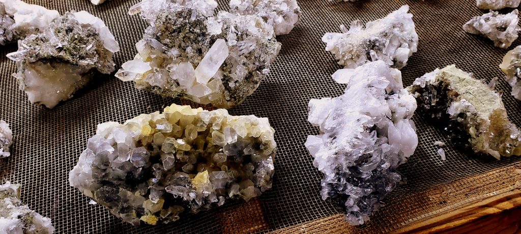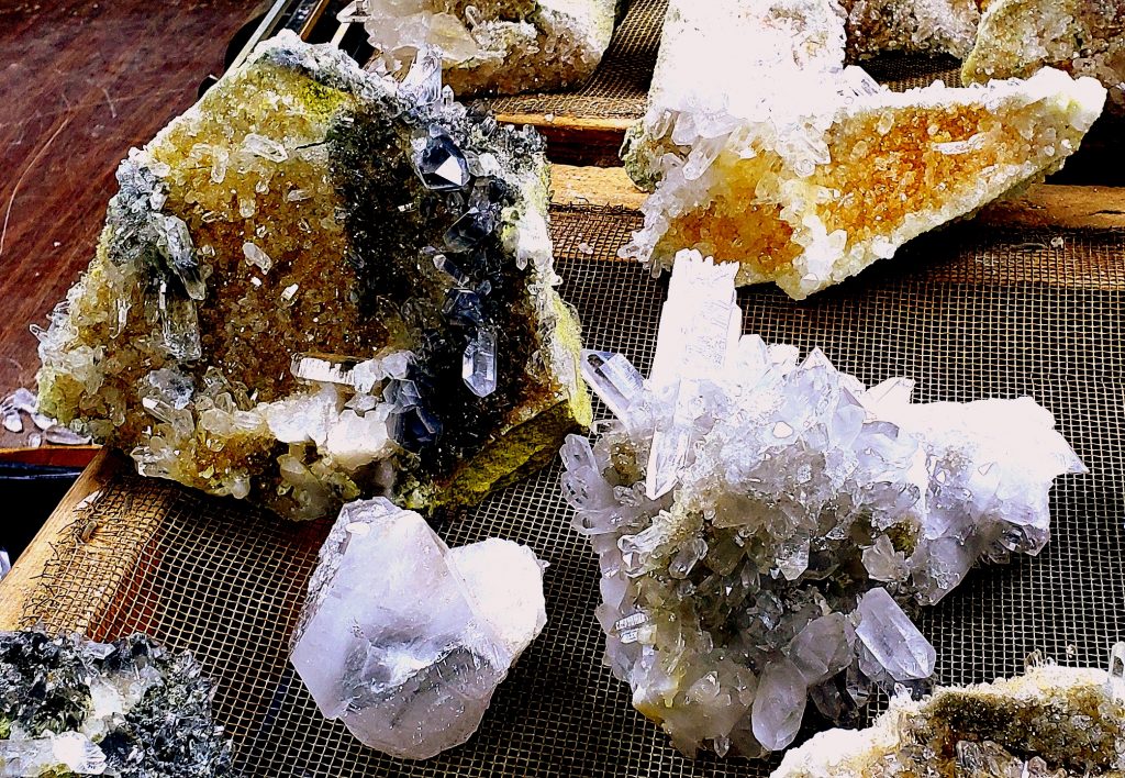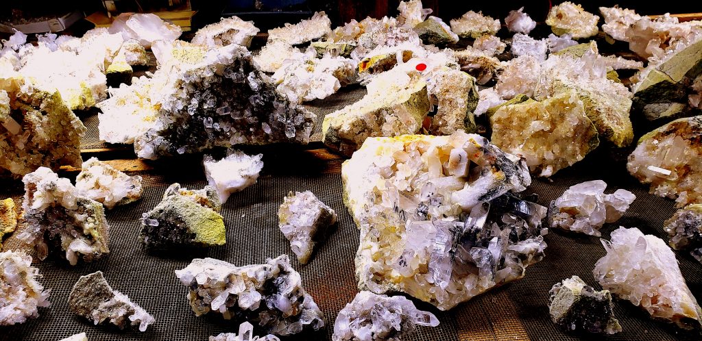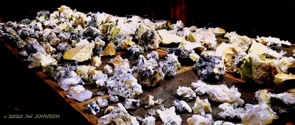 You pay for five hours of digging time and take home whatever you want from there. Mike had turned over the piles the day before we were there and did a pretty good job of it. I filled two buckets but purchased a couple of small plates of better stuff when we returned to the gift barn. Mike also took me down into the basement to see a few hundred clusters that he and a few other miners had harvested from pit pockets the week or two before we arrived…talk about CANDYLAND !!