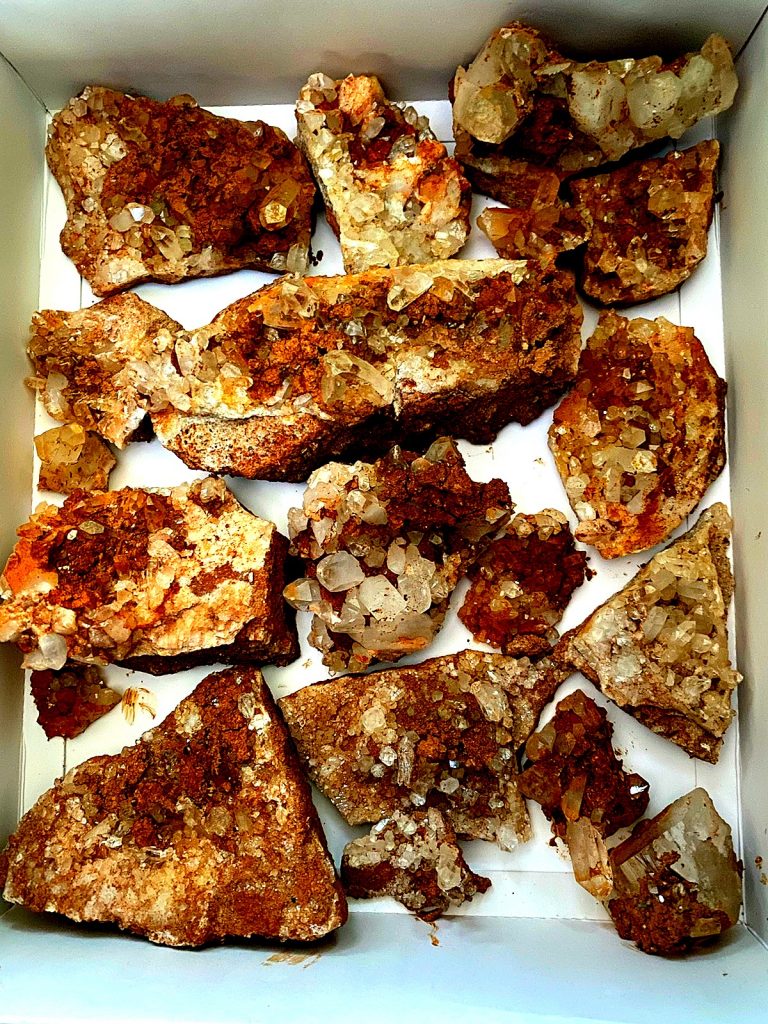 Onyx and I got on the way down there fairly early in the morning, intending to stop off at Justin`s with a load of flats and some larger druse plates, that he was in need of for his online store. He always has some nice and neat stuff, so I purchased a nice calcite from Mexico from him…pretty neat looking material….