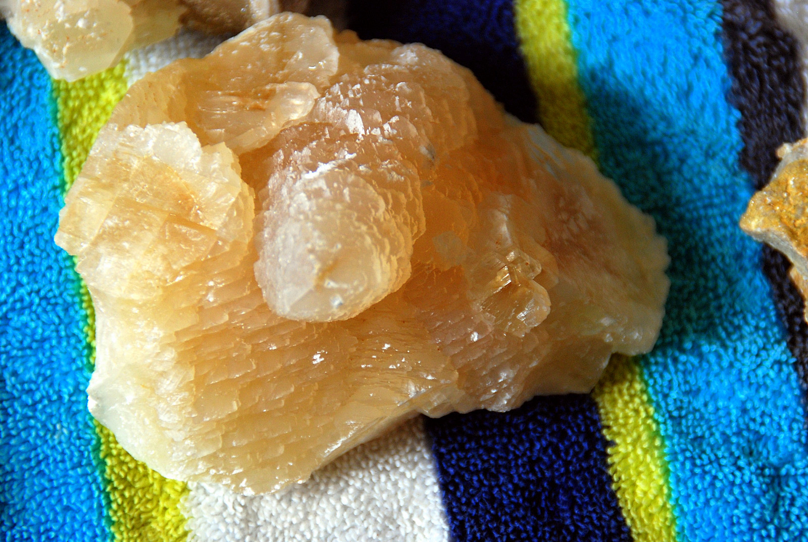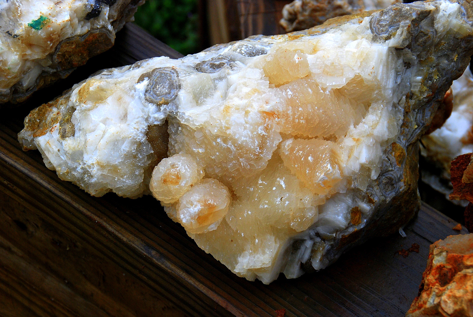 I had no more climbed up on a set of big boulders to look around when I rolled a small one back and discovered a nice set of green poker chips on a cluster of druse, and boy did that make my day…I have often wished to find some green colored poker chips after seeing a lot of calcite in that color allover in chunks and massive. I took that one and another one to the truck and then decided to take a look at a massive seam of calcite that seemed to be calling out to me.