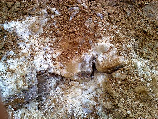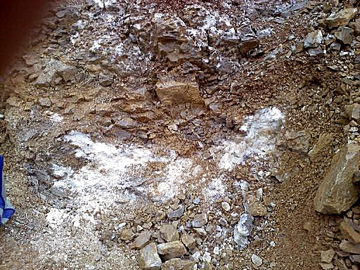 I started digging into the base of this seam… this stuff was pure white and like slivers of snow tightly packed together, I was using a hand rake and raking thru it and all of a sudden small poker chip crystals starting falling out of the massive seam all over the place, so I thought, well I have some extra time, lets dig a little deeper and see what happens…and so I did, dug in deeper and started seeing more crystals popping out of the woodwork so to speak.