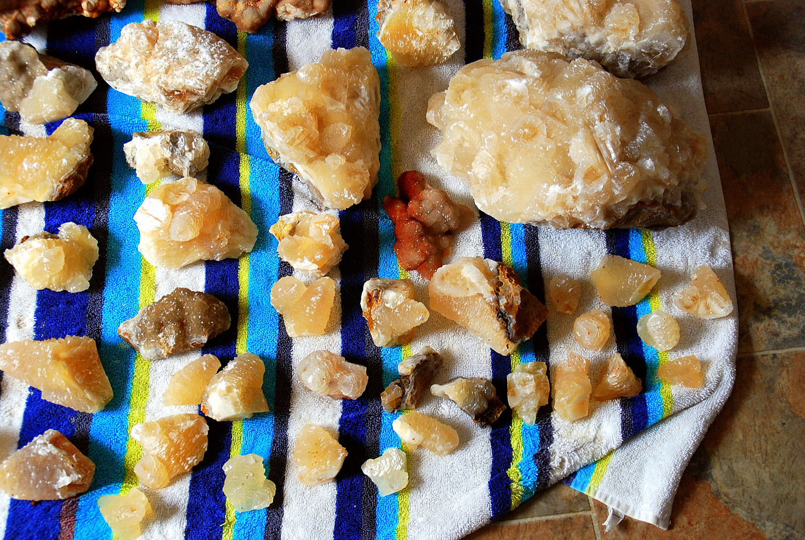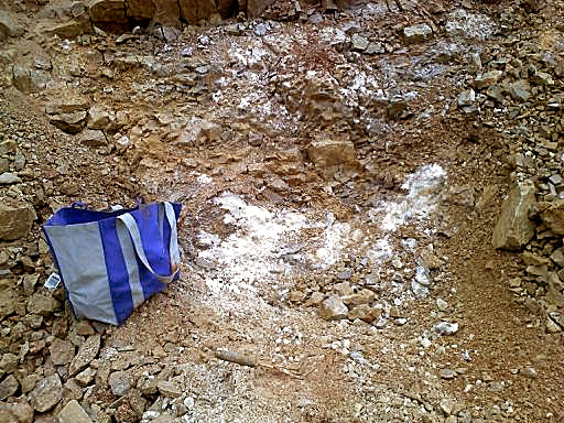 by this time, fifteen minutes passed by and I had half a canvas bag full of loose crystals alone and I am six inches deep into the pile of tightly packed rocks…so I sit back and take another look ad lo and behold, discover that by looking closer into the pocket I am digging into, it appears that it goes farther to the right and up at least another two feet higher and wider…..