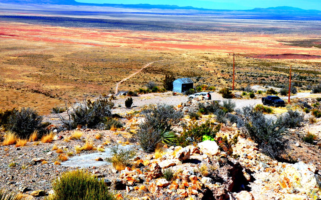 …and this below is the view looking down the hill from the top of the tailing pile and across to the outcrop of rocks where we parked, which would be where you see the road leading north from it across the way….