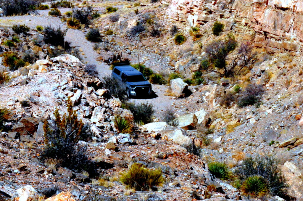 This year, I decided to go back to that hill with the tailing piles and see what was left, so I led the group over to it that morning after breakfast…we had a little trouble getting there, when we got to the turn off on to the road just past the Ore Chute, and maybe a quarter of the way up that road, it didn`t look right to me, so I came to a stop and told everyone to hang tight while I drove on up to check it out. I seriously thought we were on the wrong road because it looked nothing like it did a few years ago when we drove out there again in 2023, so I turned around at a wide spot and returned to the group waiting on me, and after getting them all turned around, we headed on down the main road to the north. About a mile or so down the main road, tho, we came to a dirt road on the left that I knew led to a small campground next to a rock bluff, and I knew then that we had indeed been on the right road moments before, so I turned around and everyone followed me back to that road and up it we went again. It was in much rougher condition than it had been just three years ago, I guess the BLM doesn`t take good care of their roads like the USFS does, at least in Arkansas they do, maybe they don`t out west. At any rate, we reached the outcrop of huge rocks by the road and we parked there….three years ago you could have parked 20 vehicles there, this year there were maybe five good parking spaces and then you had to create your own parking space and still leave that road open for traffic driving thru.